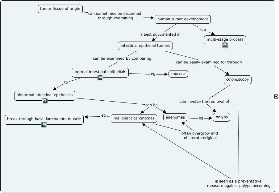 This Concept Map, created with IHMC CmapTools, has information related to: chapter 11-2, malignant carcinomas eg break through basal lamina into muscle, intestinal epithelial tumors can be examined by comparing normal intestinal epithelials, intestinal epithelial tumors can be easily examined for through colonoscopy, abnormal intestinal epithelials can be malignant carcinomas, human tumor development is best documented in intestinal epithelial tumors, normal intestinal epithelials to abnormal intestinal epithelials, normal intestinal epithelials eg mucosa, colonoscopy can involve the removal of polyps, abnormal intestinal epithelials can be adenomas, human tumor development is a multi-stage process, colonoscopy is seen as a preventative measure against polyps becoming malignant carcinomas, malignant carcinomas often overgrow and obliterate original adenomas, adenomas eg polyps, tumor tissue of origin can sometimes be discerned through examining human tumor development