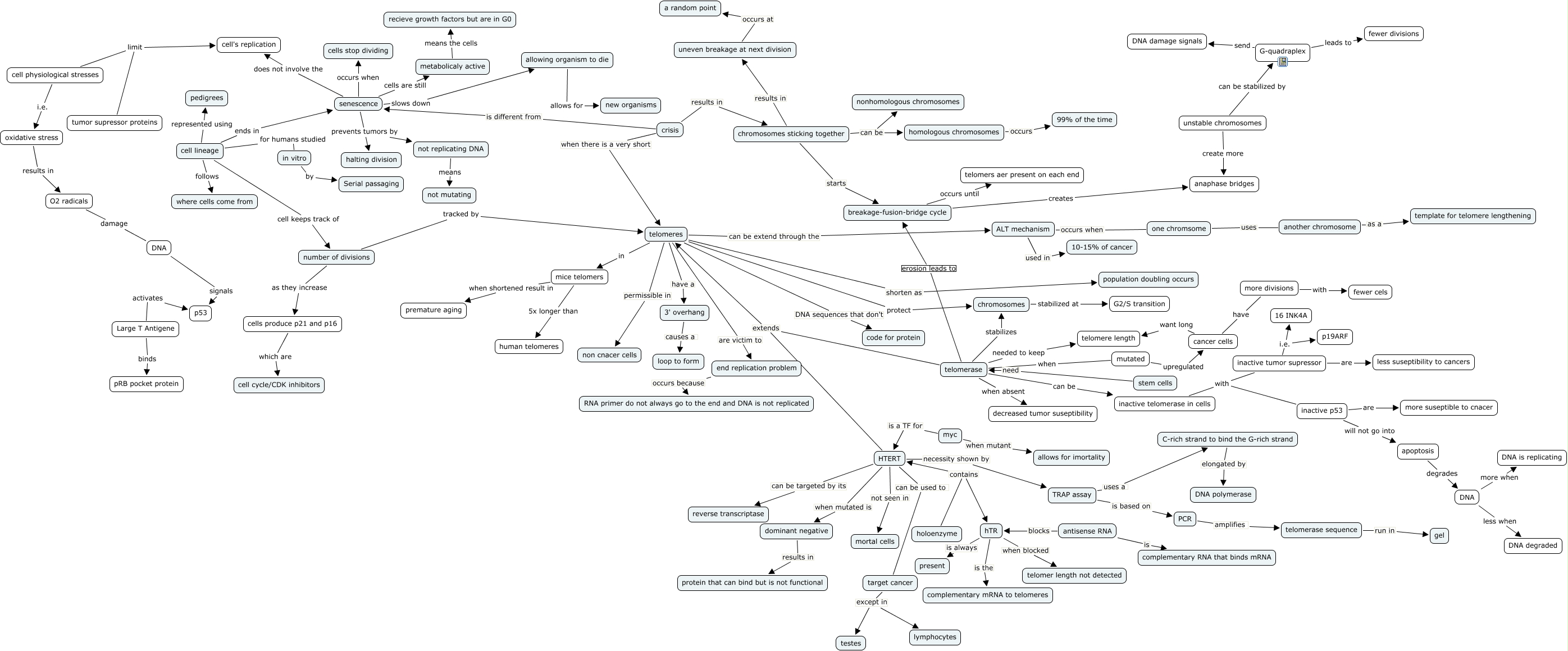 This Concept Map, created with IHMC CmapTools, has information related to: Chapter 10 discussion, senescence does not involve the cell's replication, cell physiological stresses limit cell's replication, uneven breakage at next division occurs at a random point, end replication problem occurs because RNA primer do not always go to the end and DNA is not replicated, unstable chromosomes create more anaphase bridges, mutated upregulated cancer cells, telomerase needed to keep telomere length, cell physiological stresses i.e. oxidative stress, more divisions with fewer cels, telomerase when absent decreased tumor suseptibility, HTERT when mutated is dominant negative, mice telomers when shortened result in premature aging, telomeres can be extend through the ALT mechanism, inactive telomerase in cells with inactive p53, myc when mutant allows for imortality, Large T Antigene activates p53, cell lineage cell keeps track of number of divisions, cell lineage represented using pedigrees, breakage-fusion-bridge cycle creates anaphase bridges, holoenzyme contains hTR