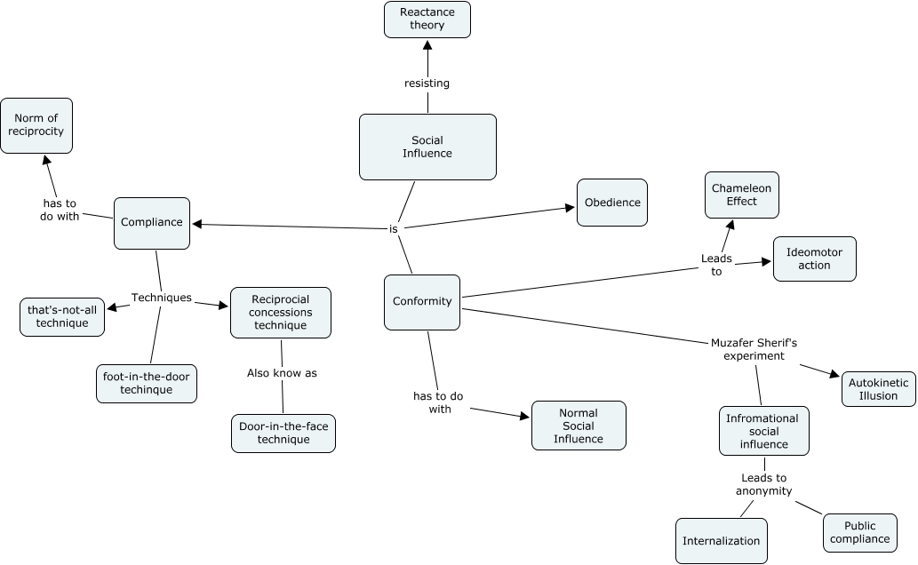 This Concept Map, created with IHMC CmapTools, has information related to: Social Influence, Compliance Techniques foot-in-the-door techinque, Social Influence is Conformity, Conformity Muzafer Sherif's experiment Autokinetic Illusion, Compliance Techniques that's-not-all technique, Social Influence is Compliance, Conformity Muzafer Sherif's experiment Infromational social influence, Reciprocial concessions technique Also know as Door-in-the-face technique, Infromational social influence Leads to anonymity Public compliance, Conformity Leads to Chameleon Effect, Social Influence resisting Reactance theory, Infromational social influence Leads to anonymity Internalization, Conformity has to do with Normal Social Influence, Compliance Techniques Reciprocial concessions technique, Compliance has to do with Norm of reciprocity, Social Influence is Obedience, Conformity Leads to Ideomotor action