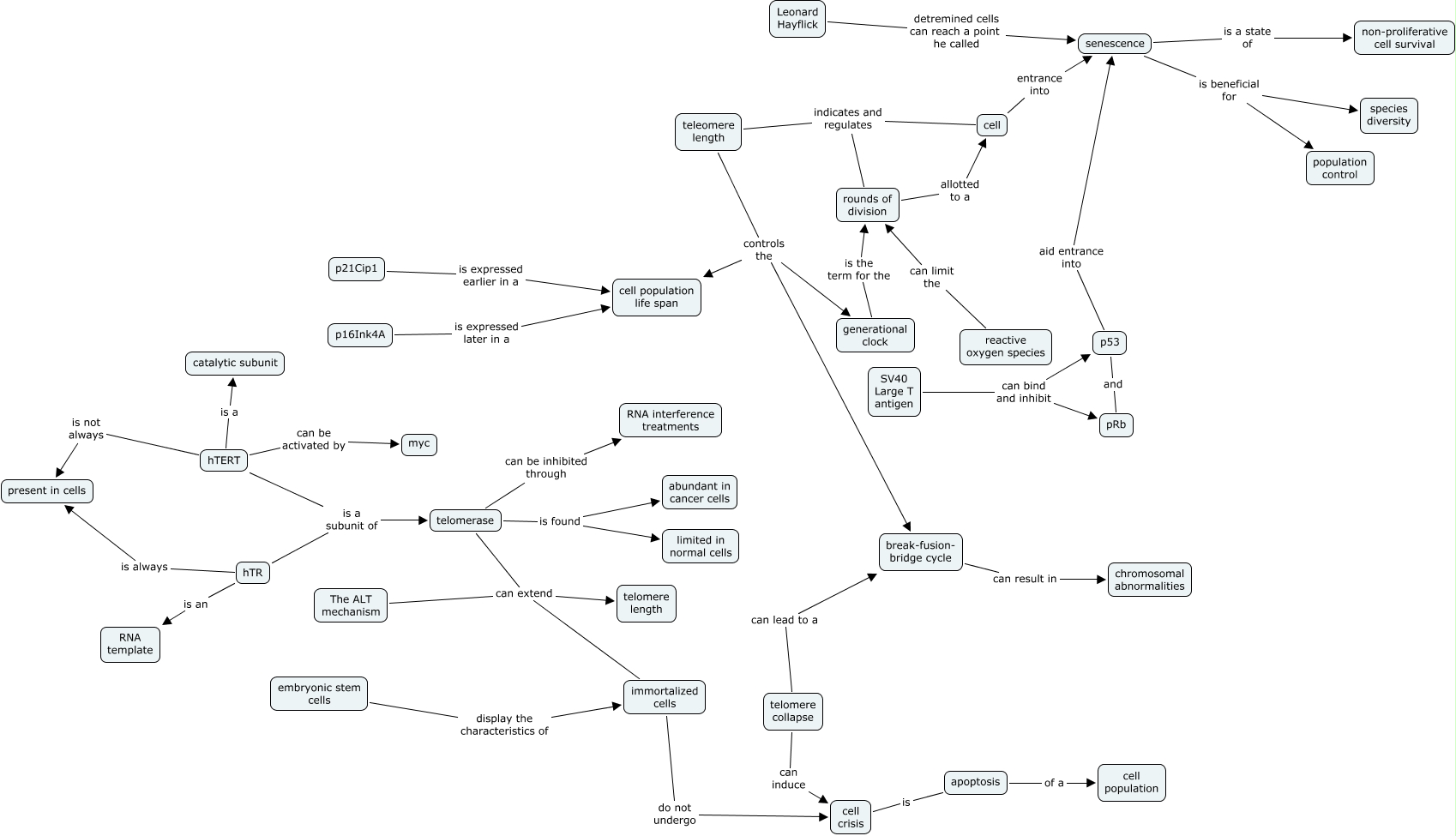 This Concept Map, created with IHMC CmapTools, has information related to: Chapter 10 class discussion 10.15.07, p21Cip1 is expressed earlier in a cell population life span, teleomere length indicates and regulates rounds of division, reactive oxygen species can limit the rounds of division, telomere collapse can induce cell crisis, cell crisis is apoptosis, The ALT mechanism can extend telomere length, teleomere length controls the break-fusion- bridge cycle, hTERT is a subunit of telomerase, SV40 Large T antigen can bind and inhibit p53, hTERT is a catalytic subunit, senescence is beneficial for population control, telomerase is found abundant in cancer cells, telomerase can extend telomere length, telomere collapse can lead to a break-fusion- bridge cycle, embryonic stem cells display the characteristics of immortalized cells, immortalized cells do not undergo cell crisis, Leonard Hayflick detremined cells can reach a point he called senescence, hTR is always present in cells, teleomere length indicates and regulates cell, apoptosis of a cell population