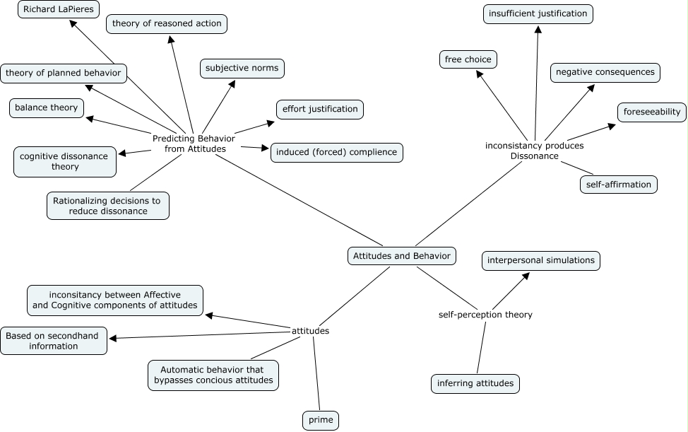 This Concept Map, created with IHMC CmapTools, has information related to: Attitudes and behavior, Attitudes and Behavior inconsistancy produces Dissonance self-affirmation, Attitudes and Behavior Predicting Behavior from Attitudes induced (forced) complience, Attitudes and Behavior attitudes prime, Attitudes and Behavior Predicting Behavior from Attitudes cognitive dissonance theory, Attitudes and Behavior inconsistancy produces Dissonance insufficient justification, Attitudes and Behavior Predicting Behavior from Attitudes effort justification, Attitudes and Behavior attitudes inconsitancy between Affective and Cognitive components of attitudes, Attitudes and Behavior attitudes Automatic behavior that bypasses concious attitudes, Attitudes and Behavior Predicting Behavior from Attitudes subjective norms, Attitudes and Behavior inconsistancy produces Dissonance negative consequences, Attitudes and Behavior Predicting Behavior from Attitudes theory of planned behavior, Attitudes and Behavior inconsistancy produces Dissonance foreseeability, Attitudes and Behavior Predicting Behavior from Attitudes Richard LaPieres, Attitudes and Behavior inconsistancy produces Dissonance free choice, Attitudes and Behavior Predicting Behavior from Attitudes balance theory, Attitudes and Behavior Predicting Behavior from Attitudes Rationalizing decisions to reduce dissonance, Attitudes and Behavior self-perception theory inferring attitudes, Attitudes and Behavior attitudes Based on secondhand information, Attitudes and Behavior Predicting Behavior from Attitudes theory of reasoned action, Attitudes and Behavior self-perception theory interpersonal simulations