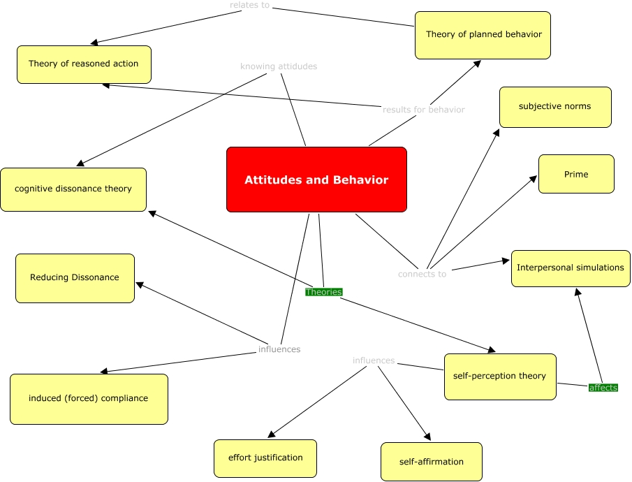 This Concept Map, created with IHMC CmapTools, has information related to: Chapter 8, self-perception theory influences self-affirmation, self-perception theory influences effort justification, Attitudes and Behavior Theories cognitive dissonance theory, Attitudes and Behavior connects to subjective norms, Attitudes and Behavior results for behavior Theory of reasoned action, Attitudes and Behavior influences Reducing Dissonance, Attitudes and Behavior connects to Interpersonal simulations, Attitudes and Behavior knowing attidudes cognitive dissonance theory, Attitudes and Behavior results for behavior Theory of planned behavior, self-perception theory affects Interpersonal simulations, Theory of planned behavior relates to Theory of reasoned action, Attitudes and Behavior Theories self-perception theory, Attitudes and Behavior influences induced (forced) compliance, Attitudes and Behavior connects to Prime