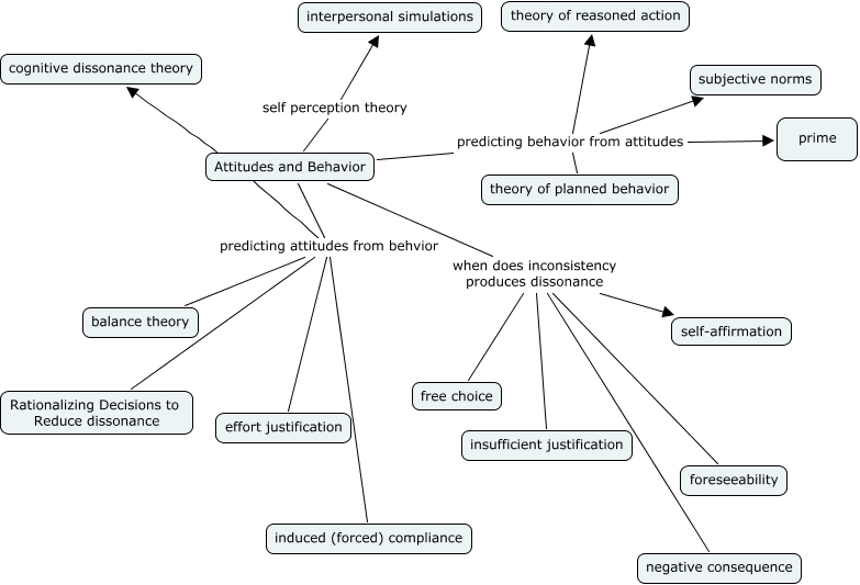 This Concept Map, created with IHMC CmapTools, has information related to: attitudes and behavior, Attitudes and Behavior when does inconsistency produces dissonance negative consequence, Attitudes and Behavior when does inconsistency produces dissonance free choice, Attitudes and Behavior when does inconsistency produces dissonance self-affirmation, Attitudes and Behavior predicting behavior from attitudes theory of reasoned action, Attitudes and Behavior predicting attitudes from behvior induced (forced) compliance, Attitudes and Behavior predicting attitudes from behvior balance theory, Attitudes and Behavior when does inconsistency produces dissonance foreseeability, Attitudes and Behavior predicting behavior from attitudes theory of planned behavior, Attitudes and Behavior predicting attitudes from behvior Rationalizing Decisions to Reduce dissonance, Attitudes and Behavior self perception theory interpersonal simulations, Attitudes and Behavior predicting behavior from attitudes subjective norms, Attitudes and Behavior predicting attitudes from behvior cognitive dissonance theory, Attitudes and Behavior predicting attitudes from behvior effort justification, Attitudes and Behavior predicting behavior from attitudes prime, Attitudes and Behavior when does inconsistency produces dissonance insufficient justification