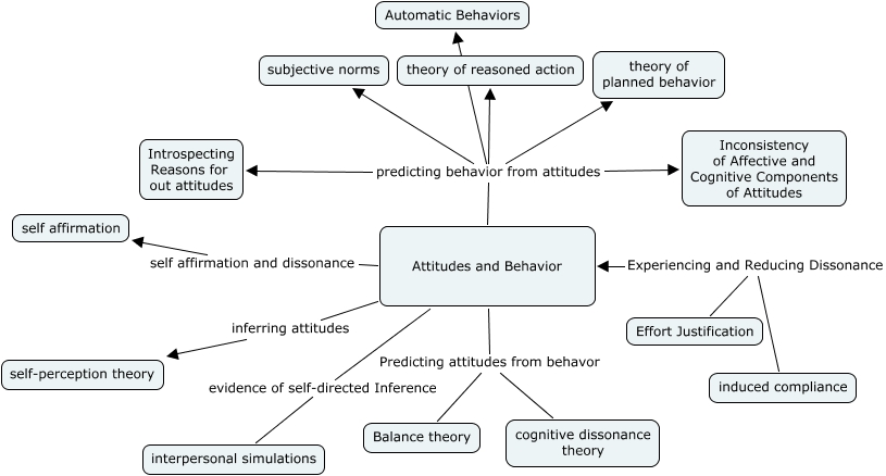 This Concept Map, created with IHMC CmapTools, has information related to: Attitudes and Behaviors, Attitudes and Behavior predicting behavior from attitudes theory of reasoned action, Attitudes and Behavior Predicting attitudes from behavor Balance theory, Effort Justification Experiencing and Reducing Dissonance Attitudes and Behavior, Attitudes and Behavior predicting behavior from attitudes theory of planned behavior, Attitudes and Behavior predicting behavior from attitudes Automatic Behaviors, Attitudes and Behavior self affirmation and dissonance self affirmation, Attitudes and Behavior predicting behavior from attitudes Inconsistency of Affective and Cognitive Components of Attitudes, Effort Justification Experiencing and Reducing Dissonance induced compliance, Attitudes and Behavior Predicting attitudes from behavor cognitive dissonance theory, Attitudes and Behavior predicting behavior from attitudes subjective norms, Attitudes and Behavior evidence of self-directed Inference interpersonal simulations, Attitudes and Behavior inferring attitudes self-perception theory, Attitudes and Behavior predicting behavior from attitudes Introspecting Reasons for out attitudes