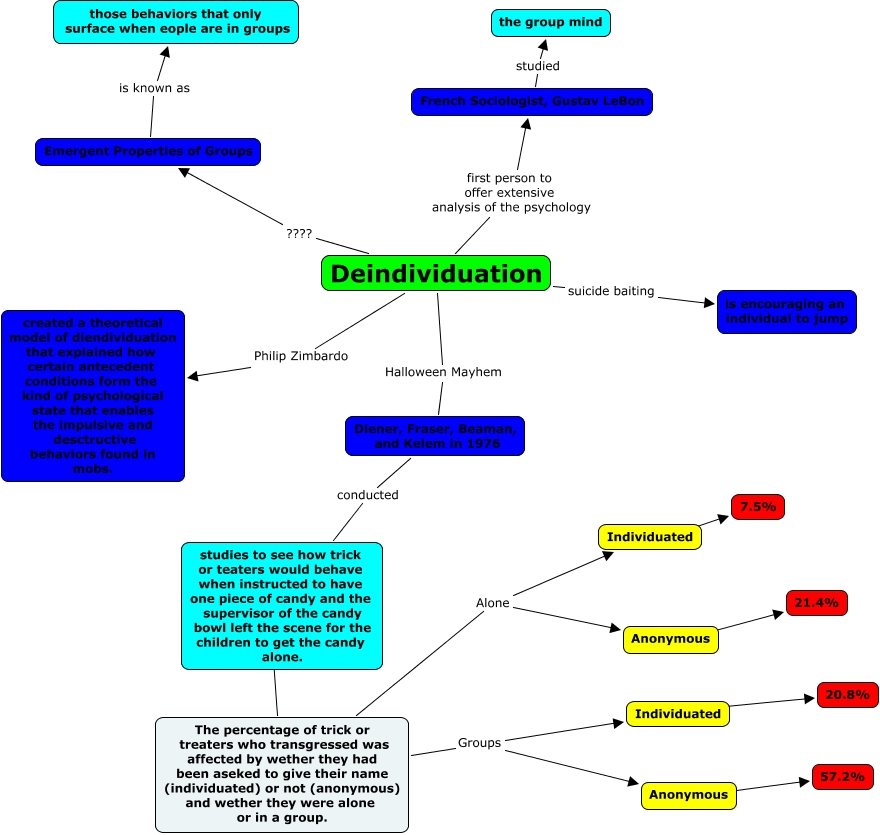 This Concept Map, created with IHMC CmapTools, has information related to: Diendividuation, Deindividuation first person to offer extensive analysis of the psychology French Sociologist, Gustav LeBon, Individuated ???? 20.8%, The percentage of trick or treaters who transgressed was affected by wether they had been aseked to give their name (individuated) or not (anonymous) and wether they were alone or in a group. Alone Anonymous, Deindividuation suicide baiting is encouraging an individual to jump, The percentage of trick or treaters who transgressed was affected by wether they had been aseked to give their name (individuated) or not (anonymous) and wether they were alone or in a group. Alone Individuated, Diener, Fraser, Beaman, and Kelem in 1976 conducted studies to see how trick or teaters would behave when instructed to have one piece of candy and the supervisor of the candy bowl left the scene for the children to get the candy alone., Individuated ???? 7.5%, French Sociologist, Gustav LeBon studied the group mind, studies to see how trick or teaters would behave when instructed to have one piece of candy and the supervisor of the candy bowl left the scene for the children to get the candy alone. ???? The percentage of trick or treaters who transgressed was affected by wether they had been aseked to give their name (individuated) or not (anonymous) and wether they were alone or in a group., Emergent Properties of Groups is known as those behaviors that only surface when eople are in groups, The percentage of trick or treaters who transgressed was affected by wether they had been aseked to give their name (individuated) or not (anonymous) and wether they were alone or in a group. Groups Individuated, Anonymous ???? 21.4%, Deindividuation Halloween Mayhem Diener, Fraser, Beaman, and Kelem in 1976, Anonymous ???? 57.2%, Deindividuation Philip Zimbardo created a theoretical model of diendividuation that explained how certain antecedent conditions form the kind of psychological state that enables the impulsive and desctructive behaviors found in mobs., Deindividuation ???? Emergent Properties of Groups, The percentage of trick or treaters who transgressed was affected by wether they had been aseked to give their name (individuated) or not (anonymous) and wether they were alone or in a group. Groups Anonymous