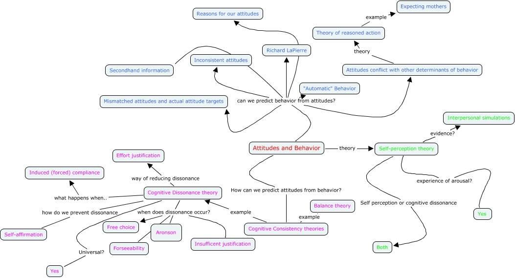 This Concept Map, created with IHMC CmapTools, has information related to: Attitudes and Behavior, Attitudes conflict with other determinants of behavior theory Theory of reasoned action, Cognitive Dissonance theory when does dissonance occur? Insufficent justification, Attitudes and Behavior can we predict behavior from attitudes? Reasons for our attitudes, Cognitive Dissonance theory Universal? Yes, Attitudes and Behavior can we predict behavior from attitudes? Inconsistent attitudes, Attitudes and Behavior can we predict behavior from attitudes? "Automatic" Behavior, Cognitive Dissonance theory how do we prevent dissonance Self-affirmation, Cognitive Consistency theories example Balance theory, Self-perception theory evidence? Interpersonal simulations, Attitudes and Behavior How can we predict attitudes from behavior? Cognitive Consistency theories, Cognitive Consistency theories example Cognitive Dissonance theory, Cognitive Dissonance theory when does dissonance occur? Forseeability, Self-perception theory experience of arousal? Yes, Attitudes and Behavior can we predict behavior from attitudes? Secondhand information, Self-perception theory Self perception or cognitive dissonance Both, Attitudes and Behavior theory Self-perception theory, Cognitive Dissonance theory when does dissonance occur? Aronson, Attitudes and Behavior can we predict behavior from attitudes? Richard LaPierre, Cognitive Dissonance theory when does dissonance occur? Free choice, Cognitive Dissonance theory what happens when.. Induced (forced) compliance