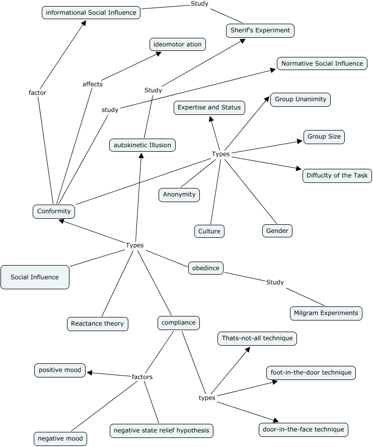 This Concept Map, created with IHMC CmapTools, has information related to: Chapter 6, Social Influence Types Conformity, obedince Study Milgram Experiments, informational Social Influence Study Sherif's Experiment, Conformity Types Group Unanimity, Social Influence Types obedince, compliance types Thats-not-all technique, Conformity factor informational Social Influence, Conformity Types Diffuclty of the Task, compliance factors negative state relief hypothesis, Conformity Types Group Size, Social Influence Types autokinetic Illusion, Social Influence Types Reactance theory, autokinetic Illusion Study Sherif's Experiment, compliance factors positive mood, compliance types foot-in-the-door technique, Conformity study Normative Social Influence, Conformity Types Gender, Conformity affects ideomotor ation, Conformity Types Anonymity, Social Influence Types compliance