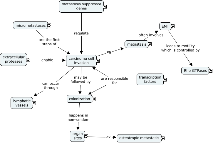 This Concept Map, created with IHMC CmapTools, has information related to: Chapter 14 complete, breast milk formation causes secretion of PTHrP parathyroid hormone-related protein, erythrocytes are easily deformed, genetically heterogeneous occurs in EMT, metastasis can lead to micrometastases, carcinoma cell invasion can occur through lymphatic vessels, EGF epidermal GF is used for signalling by the stroma, MMPs if constitutively expressed, Rho GTPases effects are different in each type of cells, primary tumors expand in colon ex: disrupt passage thru colon, rate-limiting determinant of invasion-metastasis cascade, prostate cancer cells express ET-1 receptor, osteolytic metastasis can be slowed by OPG derivatives, Rho GTPases control cell shape, Tiam1 eg GEF guanine exchange factor, carcinoma cell invasion may be followed by colonization, marrow detect micrometastases, embryogenesis have similar EMTs, solitary dormant tumor cells persist many weeks in the liver, osteoblasts can activate or suppress osteoclasts, EMT eg cell morphology changes from highly differentiated to motile spindle shaped and metastatic