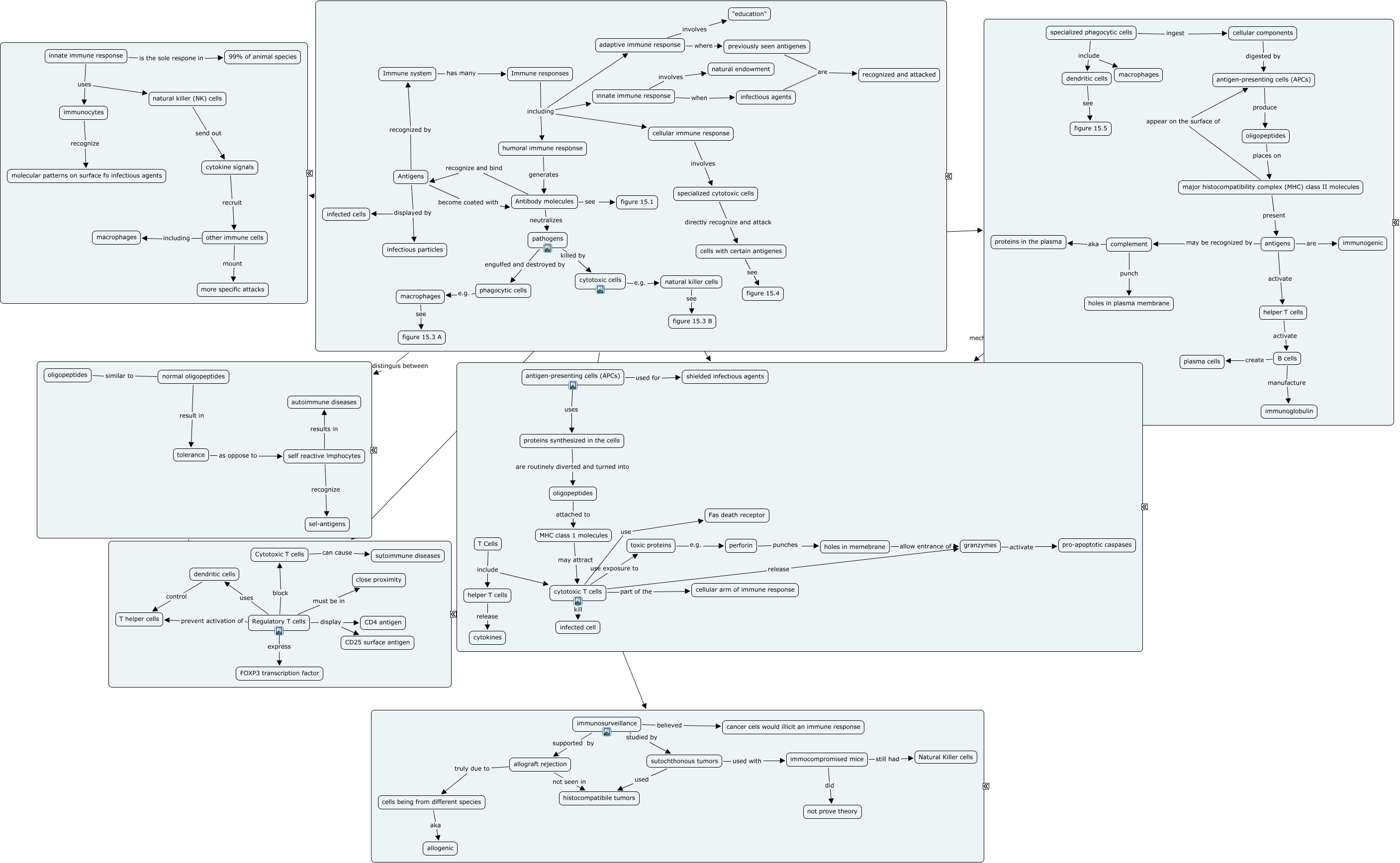 This Concept Map, created with IHMC CmapTools, has information related to: Chapter 15, Regulatory T cells must be in close proximity, Regulatory T cells display CD4 antigen, major histocompatibility complex (MHC) class II molecules appear on the surface of antigen-presenting cells (APCs), tolerance as oppose to self reactive lmphocytes, Antigens recognized by Immune system, innate immune response is the sole respone in 99% of animal species, adaptive immune response where previously seen antigenes, previously seen antigenes are recognized and attacked, cells with certain antigenes see figure 15.4, innate immune response involves natural endowment, other immune cells mount more specific attacks, humoral immune response generates Antibody molecules, cytotoxic T cells use exposure to toxic proteins, specialized phagocytic cells include dendritic cells, antigen-presenting cells (APCs) uses proteins synthesized in the cells, allograft rejection not seen in histocompatibile tumors, cytotoxic T cells kill infected cell, B cells manufacture immunoglobulin, Immune responses including humoral immune response, immunosurveillance studied by sutochthonous tumors