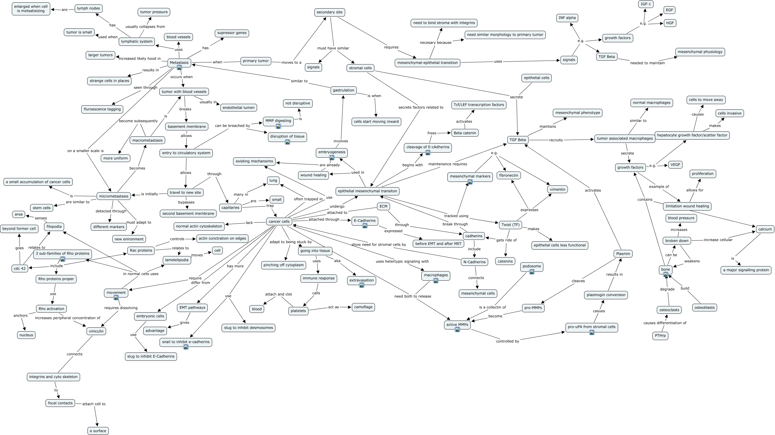 This Concept Map, created with IHMC CmapTools, has information related to: Chapter 14 discussion, Metastasis seen through fluroescence tagging, Plasmin cleaves pro-MMPs, Metastasis occurs when tumor with blood vessels, epithelial mesenchymal transiton used in embryogenesis, macrometastasis is tumor with blood vessels, travel to new site bypasses second basement membrane, filopodia senses area, growth factors e.g. hepatocyte growth factor/scatter factor, tumor with blood vessels usually in endothelial lumen, secondary site must have similar signals, wound healing are already existing mechansims, Rho proteins proper use Rho activation, gastrulation is when cells start moving inward, epithelial mesenchymal transiton tracked using Twist (TF), tumor associated macrophages secrete growth factors, Rac proteins relates to lamelelipodia, entry to circulatory system can be breached by disruption of tissue, Twist (TF) expresses vimentin, lamelelipodia moves cell, epithelial mesenchymal transiton begins with cleavage of E-cAdherins
