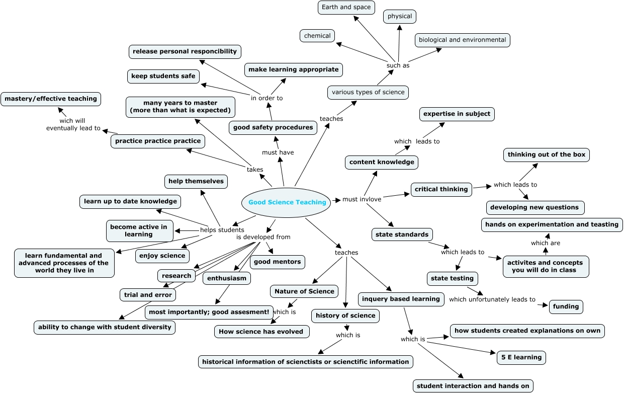 This Concept Map has information related to: HowellCMAP4, content knowledge which leads to expertise in subject, Good Science Teaching is developed from research, state standards which leads to state testing, various types of science such as biological and environmental, Good Science Teaching must invlove critical thinking, Good Science Teaching teaches Nature of Science, activites and concepts you will do in class which are hands on experimentation and teasting, state standards which leads to activites and concepts you will do in class, inquery based learning which is 5 E learning, Good Science Teaching teaches history of science