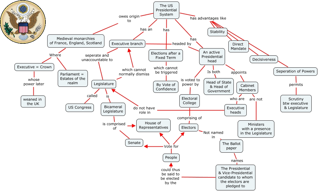 This Concept Map, created with IHMC CmapTools, has information related to: Presidential System, People Vote for Electors, Electors Not named in The Ballot paper, Executive heads do not have role in Legislature, Executive branch seperate and unaccountable to Legislature, Legislature which cannot normally dismiss Executive branch, Cabinet Members who are Executive heads, Seperation of Powers permits Scrutiny btw executive & Legislature, The US Presidential System owes origin to Medieval monarchies of France, England, Scotland, Electoral College comprising of Electors, An active Presidential head appoints Cabinet Members, An active Presidential head Is both Head of State & Head of Government, Legislature is Bicameral Legislature, The Ballot paper names The Presidential & Vice-Presidential candidate to whom the electors are pledged to, Medieval monarchies of France, England, Scotland Where Parliament = Estates of the realm, Bicameral Legislature is comprised of Senate, The US Presidential System has Elections after a Fixed Term, People Vote for Senate, Cabinet Members are not Ministers with a presence in the Legislature, Legislature called US Congress, Executive branch headed by An active Presidential head