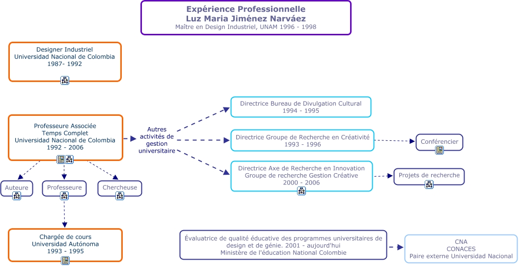 Este mapa conceptual tiene información relacionada a: Portfolio Jimenez, Professeure Associée Temps Complet Universidad Nacional de Colombia 1992 - 2006 ???? Chercheuse, Professeure Associée Temps Complet Universidad Nacional de Colombia 1992 - 2006 Autres activités de gestion universitaire Directrice Axe de Recherche en Innovation Groupe de recherche Gestion Créative 2000 - 2006, Professeure ???? Chargée de cours Universidad Autónoma 1993 - 1995, Directrice Groupe de Recherche en Créativité 1993 - 1996 ???? Conférencier, Professeure Associée Temps Complet Universidad Nacional de Colombia 1992 - 2006 Autres activités de gestion universitaire Directrice Bureau de Divulgation Cultural 1994 - 1995, Professeure Associée Temps Complet Universidad Nacional de Colombia 1992 - 2006 ???? Auteure, Directrice Axe de Recherche en Innovation Groupe de recherche Gestion Créative 2000 - 2006 ???? Projets de recherche, Professeure Associée Temps Complet Universidad Nacional de Colombia 1992 - 2006 ???? Professeure, Évaluatrice de qualité éducative des programmes universitaires de design et de génie. 2001 - aujourd'hui Ministère de l'éducation National Colombie ???? CNA CONACES Paire externe Universidad Nacional, Professeure Associée Temps Complet Universidad Nacional de Colombia 1992 - 2006 Autres activités de gestion universitaire Directrice Groupe de Recherche en Créativité 1993 - 1996