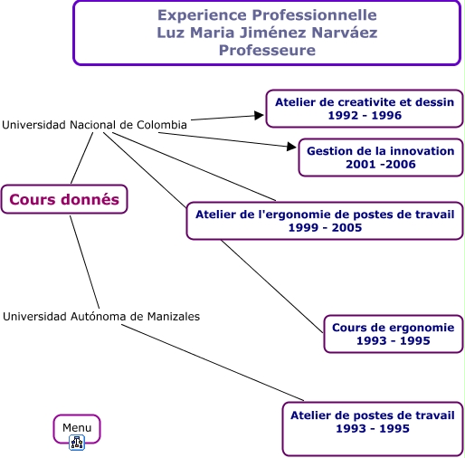Este mapa conceptual tiene información relacionada a: Cours donnés Jimenez, Cours donnés Universidad Autónoma de Manizales Atelier de postes de travail 1993 - 1995, Cours donnés Universidad Nacional de Colombia Cours de ergonomie 1993 - 1995, Cours donnés Universidad Nacional de Colombia Atelier de l'ergonomie de postes de travail 1999 - 2005, Cours donnés Universidad Nacional de Colombia Atelier de creativite et dessin 1992 - 1996, Cours donnés Universidad Nacional de Colombia Gestion de la innovation 2001 -2006