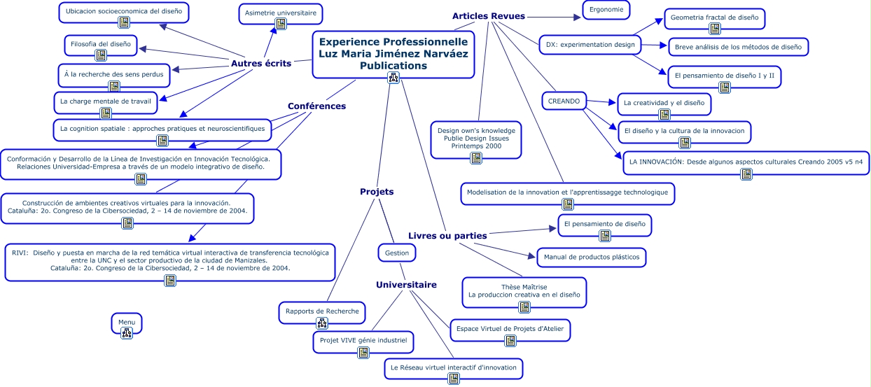 Este mapa conceptual tiene información relacionada a: Publications Luz Maria Jimenez, Experience Professionnelle Luz Maria Jiménez Narváez Publications Conférences Construcción de ambientes creativos virtuales para la innovación. Cataluña: 2o. Congreso de la Cibersociedad, 2 – 14 de noviembre de 2004., Experience Professionnelle Luz Maria Jiménez Narváez Publications Projets Gestion, Experience Professionnelle Luz Maria Jiménez Narváez Publications Conférences Conformación y Desarrollo de la Línea de Investigación en Innovación Tecnológica. Relaciones Universidad-Empresa a través de un modelo integrativo de diseño., Experience Professionnelle Luz Maria Jiménez Narváez Publications Projets Rapports de Recherche, Gestion Universitaire Projet VIVE génie industriel, Experience Professionnelle Luz Maria Jiménez Narváez Publications Autres écrits Asimetrie universitaire, Gestion Universitaire Le Réseau virtuel interactif d'innovation, DX: experimentation design ???? El pensamiento de diseño I y II, Experience Professionnelle Luz Maria Jiménez Narváez Publications Autres écrits La charge mentale de travail, Experience Professionnelle Luz Maria Jiménez Narváez Publications Autres écrits À la recherche des sens perdus, Experience Professionnelle Luz Maria Jiménez Narváez Publications Articles Revues Design own's knowledge Publie Design Issues Printemps 2000, Experience Professionnelle Luz Maria Jiménez Narváez Publications Livres ou parties Manual de productos plásticos, Experience Professionnelle Luz Maria Jiménez Narváez Publications Articles Revues DX: experimentation design, Experience Professionnelle Luz Maria Jiménez Narváez Publications Livres ou parties El pensamiento de diseño, Experience Professionnelle Luz Maria Jiménez Narváez Publications Autres écrits La cognition spatiale : approches pratiques et neuroscientifiques, Experience Professionnelle Luz Maria Jiménez Narváez Publications Articles Revues CREANDO, Gestion Universitaire Espace Virtuel de Projets d'Atelier, Experience Professionnelle Luz Maria Jiménez Narváez Publications Projets Gestion, Experience Professionnelle Luz Maria Jiménez Narváez Publications Articles Revues Ergonomie, CREANDO ???? La creatividad y el diseño