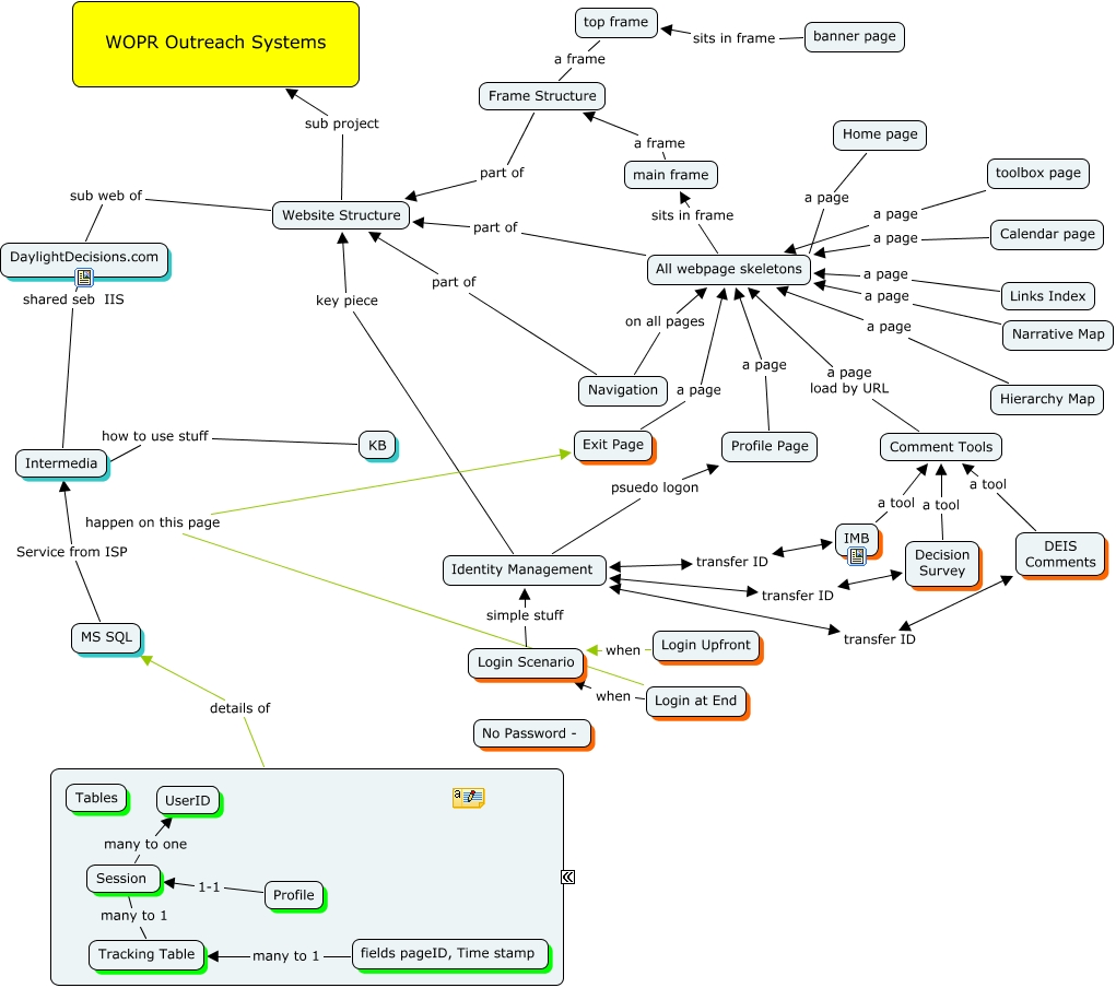 WOPRO Outreach Website Anatomy, Home page a page All webpage skeletons, Calendar page a page All webpage skeletons, Hierarchy Map a page All webpage skeletons, MS SQL Service from ISP Intermedia, Identity Management transfer ID Decision Survey, Identity Management key piece Website Structure, Navigation part of Website Structure, Navigation on all pages All webpage skeletons, Narrative Map a page All webpage skeletons, top frame a frame Frame Structure