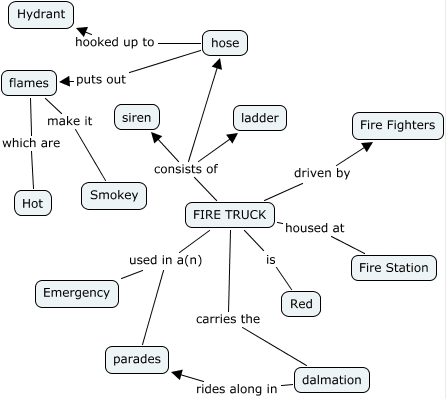 This Concept Map, created with IHMC CmapTools, has information related to: Fire Truck, FIRE TRUCK used in a(n) parades, FIRE TRUCK carries the dalmation, FIRE TRUCK consists of ladder, hose hooked up to Hydrant, FIRE TRUCK used in a(n) Emergency, FIRE TRUCK is Red, FIRE TRUCK consists of hose, flames make it Smokey, FIRE TRUCK driven by Fire Fighters, FIRE TRUCK housed at Fire Station, dalmation rides along in parades, flames which are Hot, hose puts out flames, FIRE TRUCK consists of siren