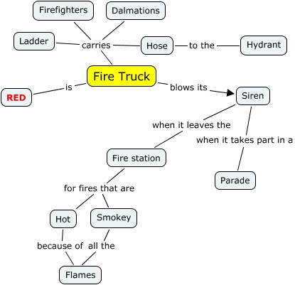 This Concept Map has information related to: Fire Truck, Siren when it takes part in a Parade, Fire Truck carries Hose, Fire Truck is RED, Siren when it leaves the Fire station, Fire Truck carries Dalmations, Fire station for fires that are Smokey, Smokey all the Flames, Fire Truck carries Firefighters, Hose to the Hydrant, Fire station for fires that are Hot