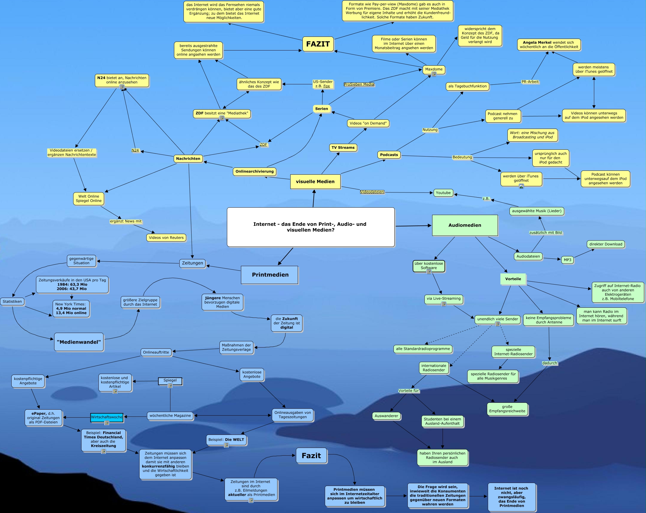 This Concept Map has information related to: Internet - Das Ende von Print- Audio- und visuellen Medien (Mo, Flo und Chris), visuelle Medien TV Streams, Podcasts Nutzung Podcast nehmen generell zu, Nachrichten Zeitungen, werden meistens über iTunes geöffnet Angela Merkel wendet sich wöchentlich an die Öffentlichkeit, Zeitungsverkäufe in den USA pro Tag 1984: 63,3 Mio 2006: 43,7 Mio New York Times: 4,9 Mio normal 13,4 Mio online, ausgewählte Musik (Lieder) z.B. Youtube, Audiomedien Vorteile keine Empfangsprobleme durch Antenne, spezielle Internet-Radiosender spezielle Radiosender für alle Musikgenres, via Live-Streaming unendlich viele Sender, FAZIT das Internet wird das Fernsehen niemals verdrängen können, bietet aber eine gute Ergänzung; zu dem bietet das Internet neue Möglichkeiten.