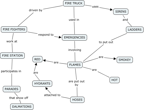 This Concept Map, created with IHMC CmapTools, has information related to: Fire Truck, FLAMES are HOT, FLAMES are SMOKEY, SIRENS and LADDERS, FIRE STATION participates in PARADES, PARADES that show off DALMATIONS, EMERGENCIES involving FLAMES, FLAMES are RED, HYDRANTS are RED, HOSES attached to HYDRANTS, FLAMES are put out by HOSES, FIRE TRUCK driven by FIRE FIGHTERS, FIRE TRUCK uses SIRENS, FIRE FIGHTERS work at FIRE STATION, FIRE FIGHTERS respond to EMERGENCIES, FIRE TRUCK used in EMERGENCIES, LADDERS to put out FLAMES