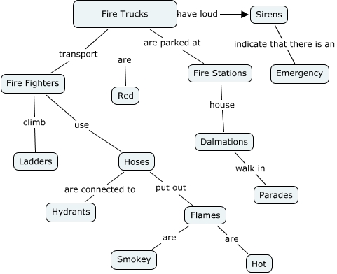 This Concept Map, created with IHMC CmapTools, has information related to: Fire Trucks, Fire Trucks are Red, Hoses put out Flames, Sirens indicate that there is an Emergency, Fire Trucks have loud Sirens, Fire Fighters climb Ladders, Hoses are connected to Hydrants, Flames are Smokey, Fire Trucks transport Fire Fighters, Fire Fighters use Hoses, Dalmations walk in Parades, Flames are Hot, Fire Stations house Dalmations, Fire Trucks are parked at Fire Stations