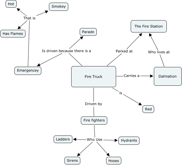 This Concept Map, created with IHMC CmapTools, has information related to: Fire Truck, Fire Truck is Red, Fire Truck Is driven because there is a Emergencey, Dalmation Who lives at The Fire Station, Fire fighters Who Use Sirens, Emergencey That is Smokey, Fire Truck Parked at The Fire Station, Fire fighters Who Use Ladders, Emergencey That is Hot, Fire Truck Is driven because there is a Parade, Fire Truck Driven by Fire fighters, Emergencey That is Has Flames, Fire Truck Carries a Dalmation, Fire fighters Who Use Hydrants, Fire fighters Who Use Hoses