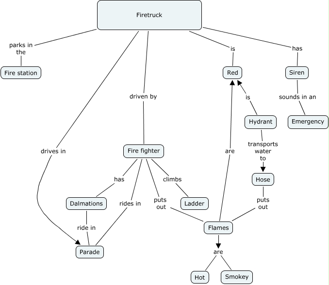 This Concept Map, created with IHMC CmapTools, has information related to: Fire Truck, Fire fighter rides in Parade, Firetruck parks in the Fire station, Flames are Red, Hydrant transports water to Hose, Fire fighter has Dalmations, Firetruck drives in Parade, Dalmations ride in Parade, Flames are Hot, Firetruck has Siren, Firetruck is Red, Firetruck driven by Fire fighter, Siren sounds in an Emergency, Flames are Smokey, Fire fighter puts out Flames, Fire fighter climbs Ladder, Hose puts out Flames