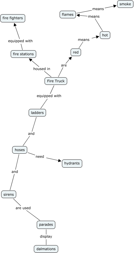 This Concept Map, created with IHMC CmapTools, has information related to: Fire Truck, hoses and sirens, fire stations equipped with fire fighters, hot means flames, parades display dalmations, sirens are used parades, red means hot, Fire Truck housed in fire stations, flames means smoke, hoses need hydrants, ladders and hoses, Fire Truck equipped with ladders, Fire Truck are red