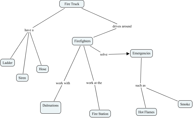 This Concept Map, created with IHMC CmapTools, has information related to: Fire Truck, Firefighters work at the Fire Station, Emergencies such as Hot Flames, Fire Truck drives around Firefighters, Fire Truck have a Ladder, Fire Truck have a Hose, Firefighters work with Dalmations, Emergencies such as Smoke, Firefighters solve Emergencies, Fire Truck have a Siren