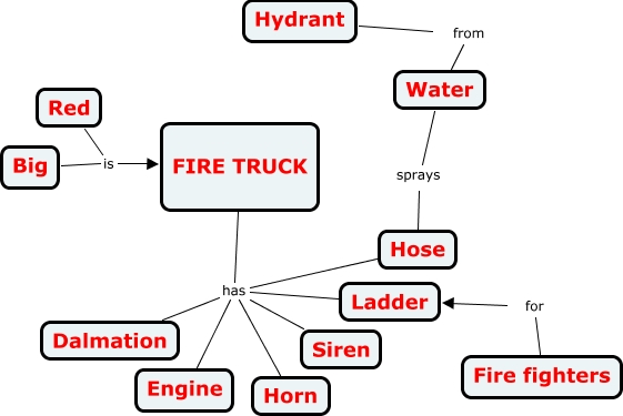 This Concept Map, created with IHMC CmapTools, has information related to: Fire Truck, Big is FIRE TRUCK, Ladder has Horn, Hydrant from Water, Engine has Horn, Water sprays Hose, Dalmation has Horn, Hose has Horn, Fire fighters for Ladder, Siren has Horn, FIRE TRUCK has Horn, Red is FIRE TRUCK