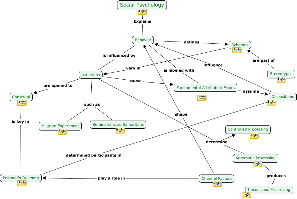 This Concept Map, created with IHMC CmapTools, has information related to: Cmap 2, Construal is key in Prisoner's Delimma, Social Psychology Explains Behavior, Channel Factors play a role in Prisoner's Delimma, situations determine Automatic Processing, situations determine Controlled Processing, Automatic Processing produces Unconcious Processing, situations are opened to Construal, situations such as Milgram Experiment, Stereotypes are part of Schemas, situations cause Fundamental Attribution Errors, Channel Factors shape Behavior, situations such as Seminarians as Samaritans, Dispositions determined participants in Prisoner's Delimma, Fundamental Attribution Errors assume Dispositions, Behavior defines Schemas, Behavior is labeled with Fundamental Attribution Errors, Behavior is influenced by situations, Dispositions influence Behavior, Schemas vary in situations
