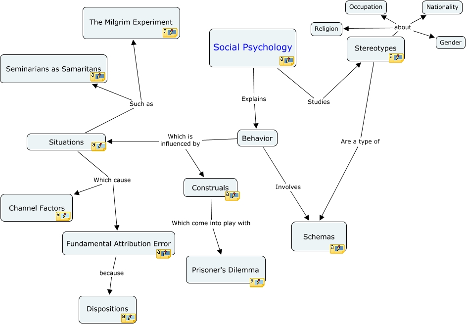 This Concept Map, created with IHMC CmapTools, has information related to: Cmap 2, Social Psychology Studies Stereotypes, Stereotypes about Nationality, Construals Which come into play with Prisoner's Dilemma, Fundamental Attribution Error because Dispositions, Stereotypes about Occupation, Stereotypes Are a type of Schemas, Behavior Which is influenced by Construals, Behavior Which is influenced by Situations, Behavior Involves Schemas, Situations Which cause Channel Factors, Situations Such as The Milgrim Experiment, Stereotypes about Gender, Situations Such as Seminarians as Samaritans, Stereotypes about Religion, Situations Which cause Fundamental Attribution Error, Social Psychology Explains Behavior