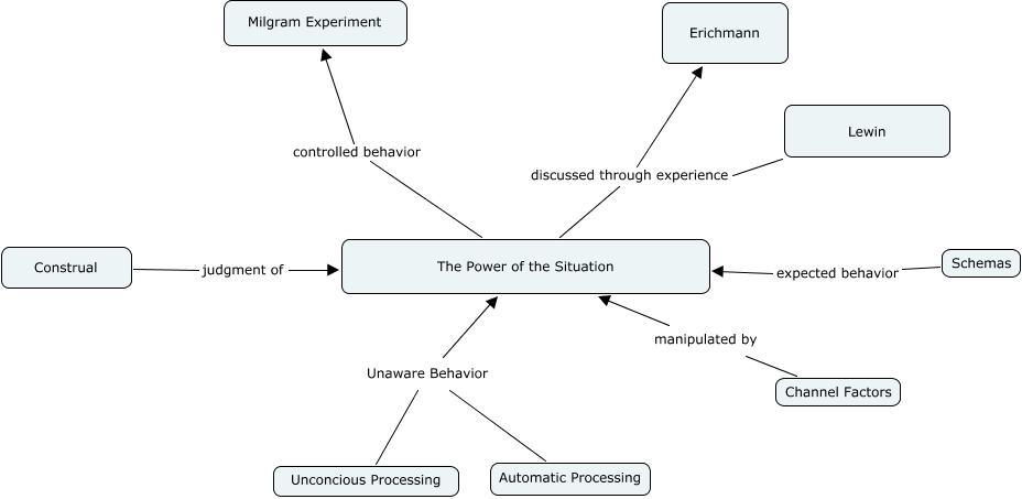 This Concept Map, created with IHMC CmapTools, has information related to: Cmap2, Unconcious Processing Unaware Behavior The Power of the Situation, Channel Factors manipulated by The Power of the Situation, Lewin discussed through experience Erichmann, Schemas expected behavior The Power of the Situation, The Power of the Situation discussed through experience Erichmann, Construal judgment of The Power of the Situation, The Power of the Situation controlled behavior Milgram Experiment, Unconcious Processing Unaware Behavior Automatic Processing