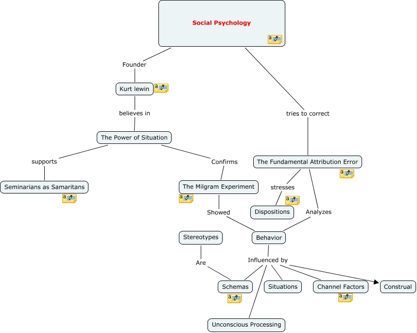 This Concept Map, created with IHMC CmapTools, has information related to: Cmap2, Social Psychology tries to correct The Fundamental Attribution Error, The Power of Situation supports Seminarians as Samaritans, The Power of Situation Confirms The Milgram Experiment, The Milgram Experiment Showed Behavior, Stereotypes Are Schemas, Behavior Influenced by Schemas, Behavior Influenced by Construal, Behavior Influenced by Situations, Kurt lewin believes in The Power of Situation, The Fundamental Attribution Error Analyzes Behavior, Behavior Influenced by Unconscious Processing, The Fundamental Attribution Error stresses Dispositions, Behavior Influenced by Channel Factors, Social Psychology Founder Kurt lewin