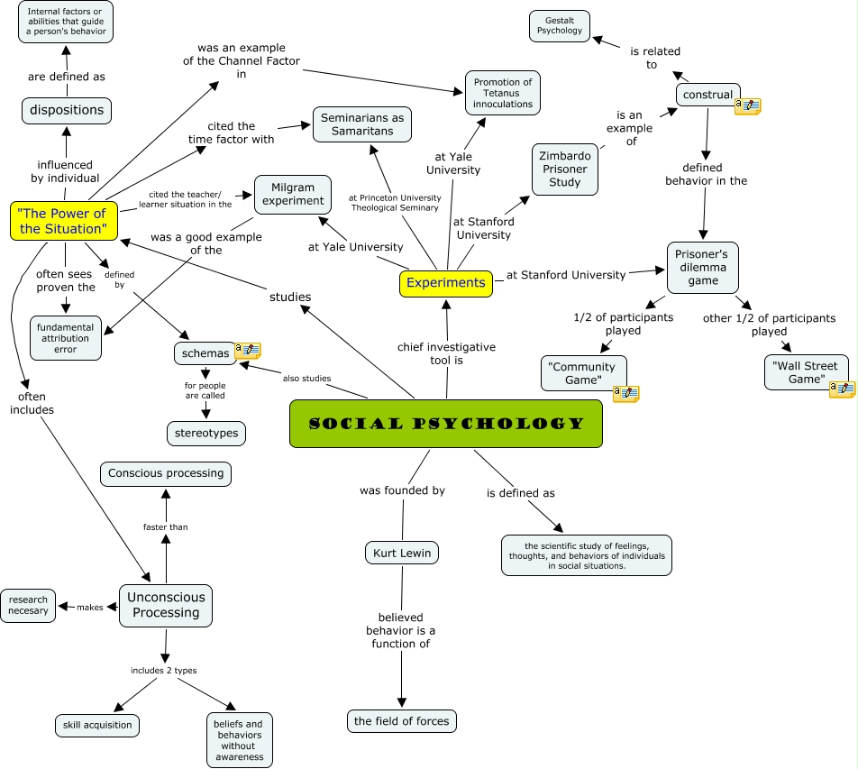 This Concept Map, created with IHMC CmapTools, has information related to: Cmap 2, Experiments at Stanford University Prisoner's dilemma game, SOCIAL PSYCHOLOGY is defined as the scientific study of feelings, thoughts, and behaviors of individuals in social situations., "The Power of the Situation" cited the time factor with Seminarians as Samaritans, Unconscious Processing faster than Conscious processing, Unconscious Processing makes research necesary, Experiments at Princeton University Theological Seminary Seminarians as Samaritans, "The Power of the Situation" influenced by individual dispositions, Experiments at Yale University Milgram experiment, construal defined behavior in the Prisoner's dilemma game, SOCIAL PSYCHOLOGY studies "The Power of the Situation", Kurt Lewin believed behavior is a function of the field of forces, construal is related to Gestalt Psychology, Unconscious Processing includes 2 types beliefs and behaviors without awareness, Prisoner's dilemma game other 1/2 of participants played "Wall Street Game", Milgram experiment was a good example of the fundamental attribution error, Experiments at Yale University Promotion of Tetanus innoculations, schemas for people are called stereotypes, SOCIAL PSYCHOLOGY was founded by Kurt Lewin, SOCIAL PSYCHOLOGY also studies schemas, SOCIAL PSYCHOLOGY chief investigative tool is Experiments