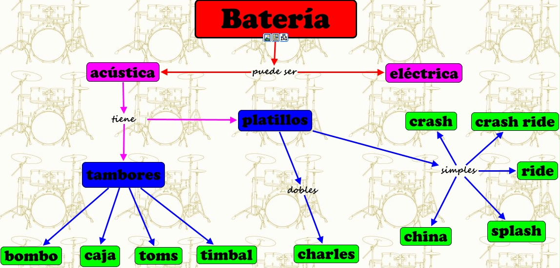 Este mapa conceptual tiene información relacionada a: bateria, tambores timbal, platillos simples ride, tambores toms, acústica tiene tambores, Batería puede ser acústica, tambores caja, platillos dobles charles, tambores bombo, platillos simples crash, platillos simples splash, platillos simples china, acústica tiene platillos, Batería puede ser eléctrica, platillos simples crash ride