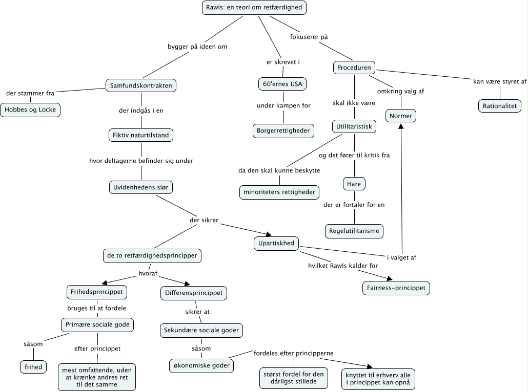 This Concept Map has information related to: Rawls - en teori om retfærdighed, Utilitaristisk da den skal kunne beskytte minoriteters rettigheder, Rawls: en teori om retfærdighed bygger på ideen om Samfundskontrakten, Uvidenhedens slør der sikrer Upartiskhed, Rawls: en teori om retfærdighed er skrevet i 60'ernes USA, økonomiske goder fordeles efter principperne knyttet til erhverv alle i princippet kan opnå, Sekundære sociale goder såsom økonomiske goder, Utilitaristisk og det fører til kritik fra Hare, Proceduren skal ikke være Utilitaristisk, 60'ernes USA under kampen for Borgerrettigheder, Upartiskhed i valget af Normer