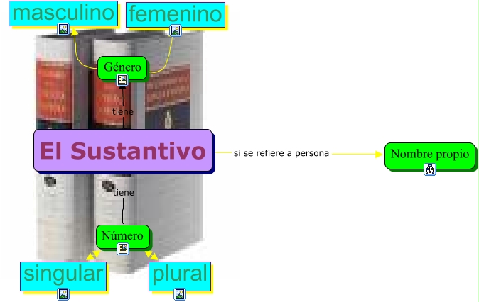 Este mapa conceptual tiene información relacionada a: index, Género masculino, El Sustantivo tiene Número, El Sustantivo tiene Género, Género femenino, El Sustantivo si se refiere a persona Nombre propio, Número singular, Número plural