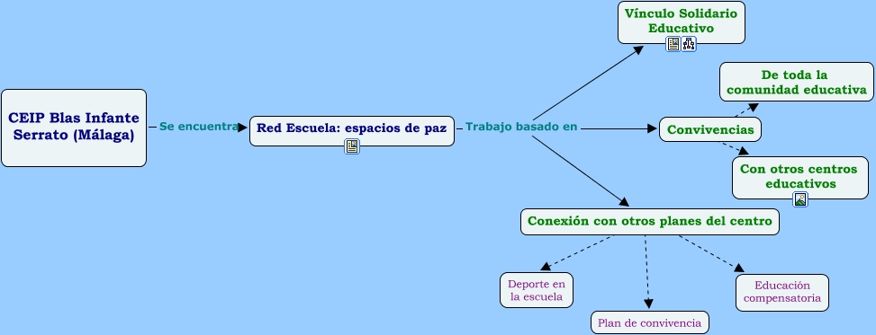 Este mapa conceptual tiene información relacionada a: IndexPresent, Convivencias ???? De toda la comunidad educativa, Conexión con otros planes del centro ???? Plan de convivencia, Conexión con otros planes del centro ???? Deporte en la escuela, Red Escuela: espacios de paz Trabajo basado en Vínculo Solidario Educativo, Red Escuela: espacios de paz Trabajo basado en Conexión con otros planes del centro, Conexión con otros planes del centro ???? Educación compensatoria, CEIP Blas Infante Serrato (Málaga) Se encuentra Red Escuela: espacios de paz, Red Escuela: espacios de paz Trabajo basado en Convivencias, Convivencias ???? Con otros centros educativos