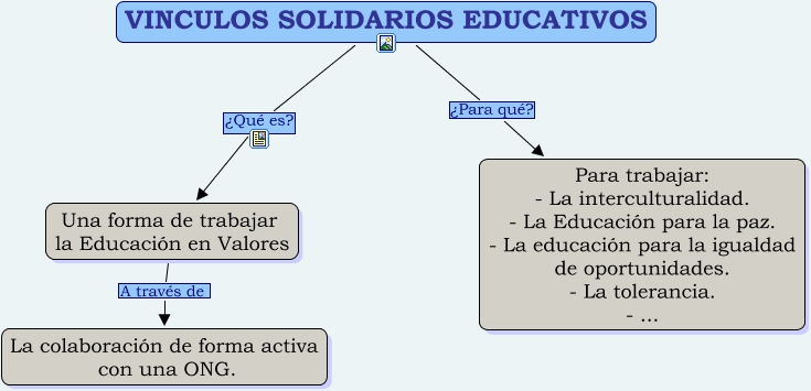 Este mapa conceptual tiene información relacionada a: VSE, VINCULOS SOLIDARIOS EDUCATIVOS ¿Para qué? Para trabajar: - La interculturalidad. - La Educación para la paz. - La educación para la igualdad de oportunidades. - La tolerancia. - ..., VINCULOS SOLIDARIOS EDUCATIVOS ¿Qué es? Una forma de trabajar la Educación en Valores, Una forma de trabajar la Educación en Valores A través de La colaboración de forma activa con una ONG.