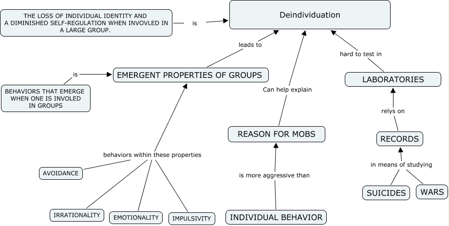 This Concept Map, created with IHMC CmapTools, has information related to: Cmap 3, AVOIDANCE behaviors within these properties IMPULSIVITY, BEHAVIORS THAT EMERGE WHEN ONE IS INVOLED IN GROUPS is EMERGENT PROPERTIES OF GROUPS, INDIVIDUAL BEHAVIOR is more aggressive than REASON FOR MOBS, REASON FOR MOBS Can help explain Deindividuation, RECORDS relys on LABORATORIES, LABORATORIES hard to test in Deindividuation, AVOIDANCE behaviors within these properties IRRATIONALITY, AVOIDANCE behaviors within these properties EMOTIONALITY, SUICIDES in means of studying WARS, SUICIDES in means of studying RECORDS, EMERGENT PROPERTIES OF GROUPS leads to Deindividuation, THE LOSS OF INDIVIDUAL IDENTITY AND A DIMINISHED SELF-REGULATION WHEN INVOVLED IN A LARGE GROUP. is Deindividuation, AVOIDANCE behaviors within these properties EMERGENT PROPERTIES OF GROUPS