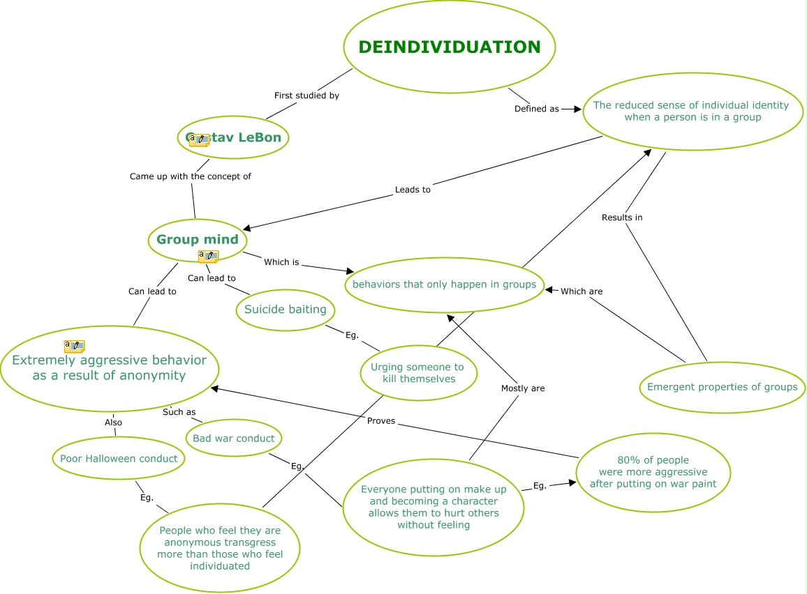 This Concept Map, created with IHMC CmapTools, has information related to: Cmap3, Gustav LeBon Came up with the concept of Group mind, Group mind Can lead to Suicide baiting, Poor Halloween conduct Eg. People who feel they are anonymous transgress more than those who feel individuated, Extremely aggressive behavior as a result of anonymity Also Poor Halloween conduct, Bad war conduct Eg. Everyone putting on make up and becoming a character allows them to hurt others without feeling, Everyone putting on make up and becoming a character allows them to hurt others without feeling Mostly are behaviors that only happen in groups, Group mind Can lead to Extremely aggressive behavior as a result of anonymity, Everyone putting on make up and becoming a character allows them to hurt others without feeling Eg. 80% of people were more aggressive after putting on war paint, People who feel they are anonymous transgress more than those who feel individuated ???? Urging someone to kill themselves, Extremely aggressive behavior as a result of anonymity Such as Bad war conduct, People who feel they are anonymous transgress more than those who feel individuated ???? The reduced sense of individual identity when a person is in a group, Emergent properties of groups Which are behaviors that only happen in groups, Suicide baiting Eg. Urging someone to kill themselves, DEINDIVIDUATION First studied by Gustav LeBon, 80% of people were more aggressive after putting on war paint Proves Extremely aggressive behavior as a result of anonymity, The reduced sense of individual identity when a person is in a group Leads to Group mind, Group mind Which is behaviors that only happen in groups, The reduced sense of individual identity when a person is in a group Results in Emergent properties of groups, DEINDIVIDUATION Defined as The reduced sense of individual identity when a person is in a group