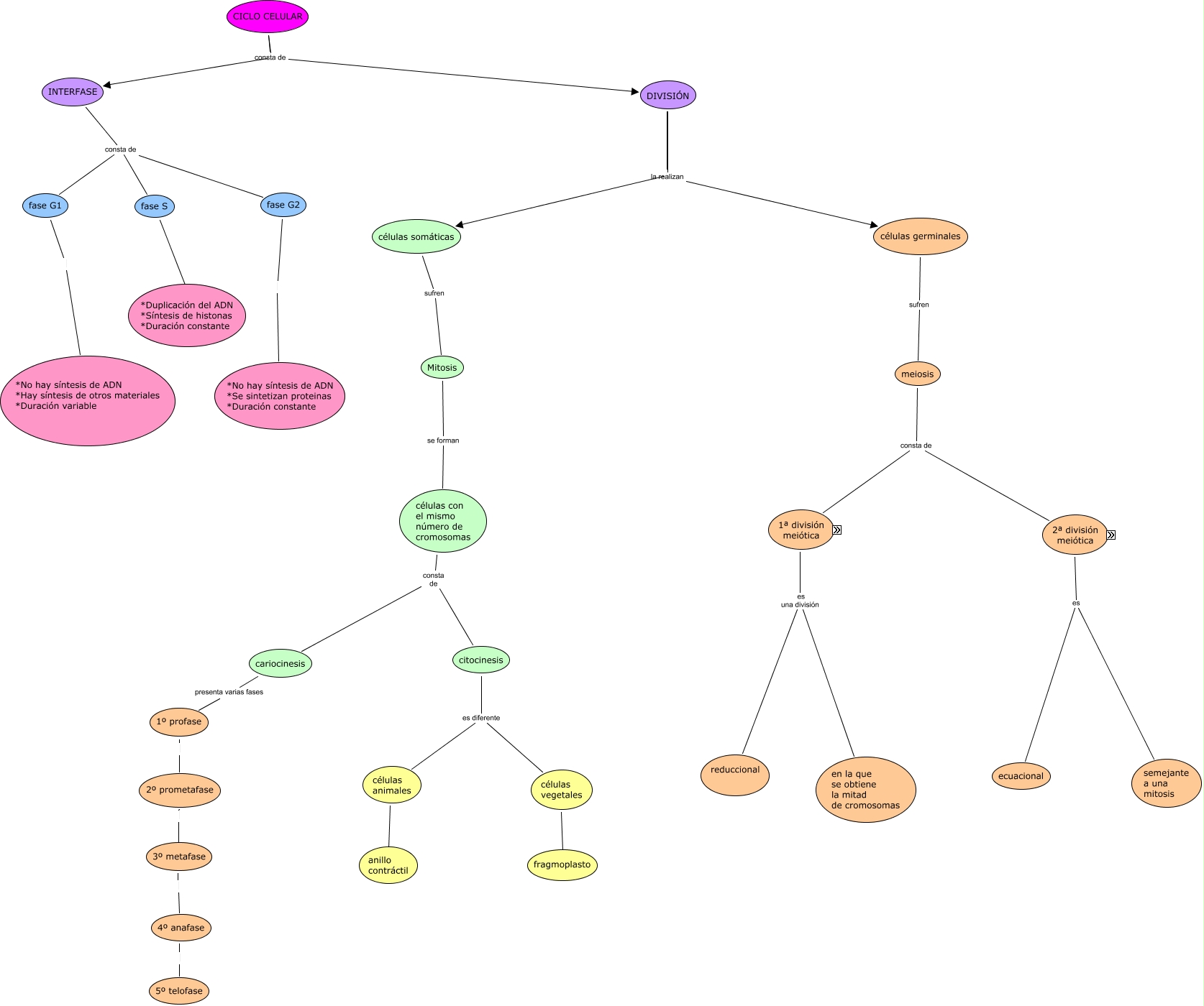 Este mapa conceptual tiene información relacionada a: presentacionciclocelular, células vegetales fragmoplasto, células animales anillo contráctil, DIVISIÓN células somáticas, CICLO CELULAR consta de DIVISIÓN, meiosis consta de 2ª división meiótica, CICLO CELULAR INTERFASE, fase G1 *No hay síntesis de ADN *Hay síntesis de otros materiales *Duración variable, células con el mismo número de cromosomas consta de citocinesis, células somáticas sufren Mitosis, células germinales sufren meiosis, meiosis consta de 1ª división meiótica, DIVISIÓN la realizan células germinales, 2ª división meiótica es semejante a una mitosis, 1ª división meiótica es una división reduccional, fase S *Duplicación del ADN *Síntesis de histonas *Duración constante, cariocinesis presenta varias fases 1º profase, 2º prometafase 3º metafase, Mitosis se forman células con el mismo número de cromosomas, INTERFASE consta de fase G1, INTERFASE consta de fase S