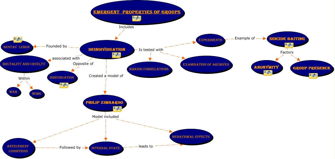 This Concept Map, created with IHMC CmapTools, has information related to: Cmap 3, Experiments Example of Suicide Baiting, Deindividuation Opposite of Individuation, Brutality and cruelty Within Mobs, Internal state leads to Behavioral Effects, Deindividuation Is tested with making Correlations, Deindividuation Created a model of Philip Zimbardo, Antecedent Conditions Followed by Internal state, Deindividuation Is tested with Experiments, Deindividuation Founded by Gustav Lebon, Brutality and cruelty Within War, Emergent Properties of Groups Includes Deindividuation, Philip Zimbardo Model included Behavioral Effects, Philip Zimbardo Model included Antecedent Conditions, Philip Zimbardo Model included Internal state, Suicide Baiting Factors group Presence, Suicide Baiting Factors Anonymity, Deindividuation associated with Brutality and cruelty, Deindividuation Is tested with Examination of Archives