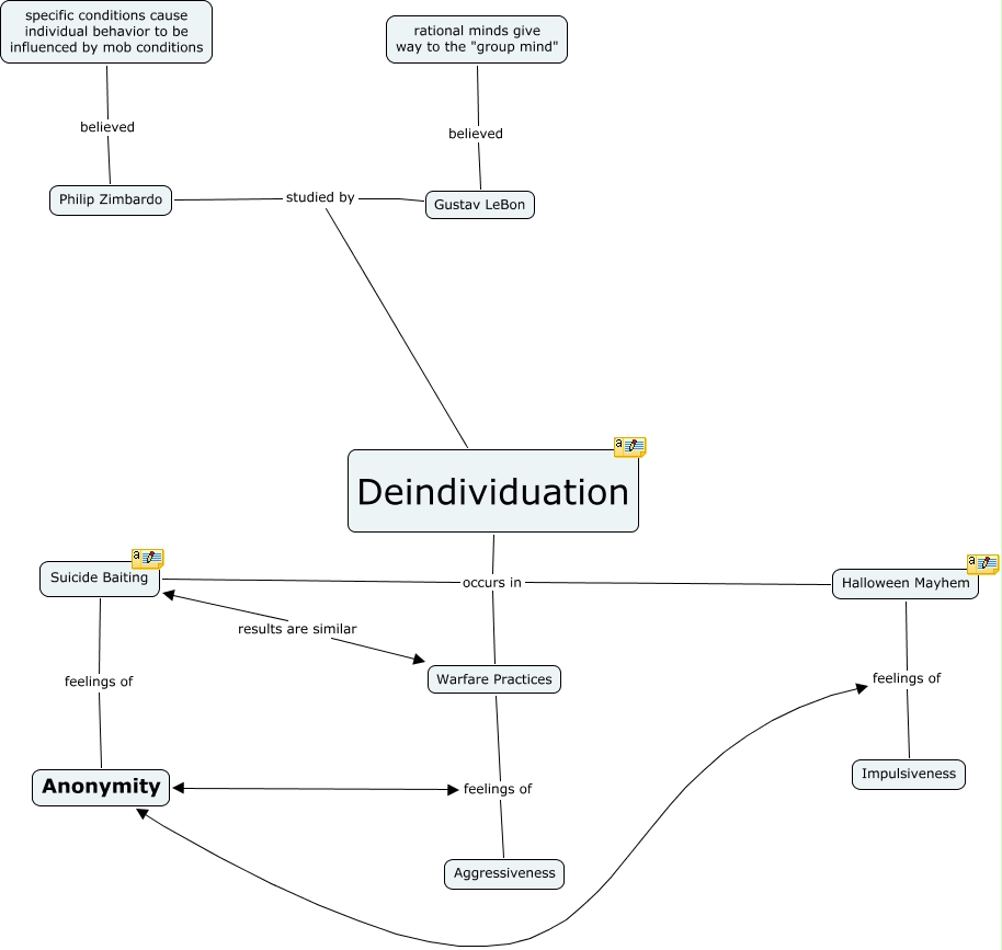 This Concept Map, created with IHMC CmapTools, has information related to: Cmap 3, Anonymity feelings of Aggressiveness, Suicide Baiting feelings of Anonymity, Philip Zimbardo believed specific conditions cause individual behavior to be influenced by mob conditions, Anonymity feelings of Impulsiveness, Deindividuation occurs in Halloween Mayhem, Gustav LeBon believed rational minds give way to the "group mind", Deindividuation studied by Philip Zimbardo, Halloween Mayhem feelings of Impulsiveness, Deindividuation occurs in Warfare Practices, Deindividuation occurs in Suicide Baiting, Warfare Practices feelings of Aggressiveness, Deindividuation studied by Gustav LeBon