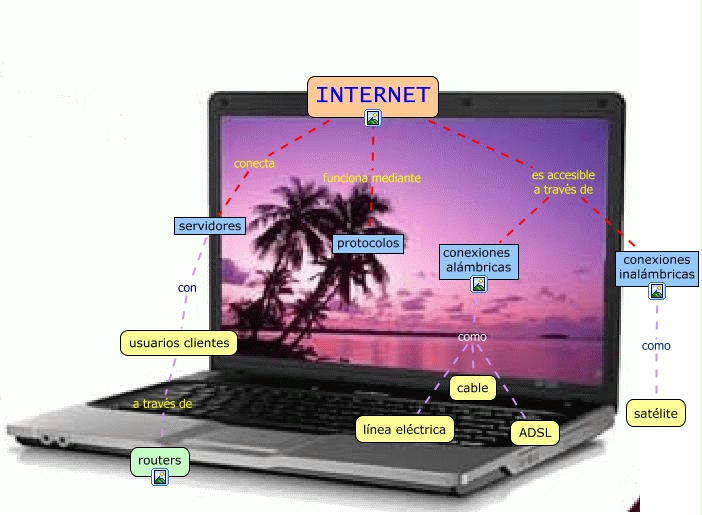 Este mapa conceptual tiene información relacionada a: INTERNET, INTERNET es accesible a través de conexiones inalámbricas, conexiones alámbricas como cable, conexiones alámbricas como línea eléctrica, usuarios clientes a través de routers, conexiones inalámbricas como satélite, INTERNET funciona mediante protocolos, INTERNET conecta servidores, INTERNET es accesible a través de conexiones alámbricas, servidores con usuarios clientes, conexiones alámbricas como ADSL