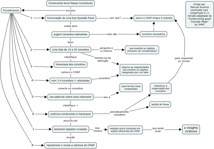 Este Mapa Conceitual tem informações relacionadas a: Construindo bons mapas conceituais, com 1-4 conceitos + relevantes considere observe as regularidades nos eventos ou objetos designados por um label, relações entre conceitos em seções diferentes do CMAP isso pode levar a insights cirativos, possíveis ligações cruzadas revisão reposicione e revise a estrtura do CMAP, formunação de uma boa Questão Focal usada para sugerir conceitos relevantes, use palavras chave para relacionar isto é para formar boas proposições, continue construindo a hierarquia procure por possíveis ligações cruzadas, sugerir conceitos relevantes fazer uma lista de 15 a 25 conceitos, Construindo bons Mapas Conceituais envolve Procedimentos, possíveis ligações cruzadas isso mostra relações entre conceitos em seções diferentes do CMAP, uma lista de 15 a 25 conceitos pergunte a si mesmo que eventos ou objetos precisam ser considerados?