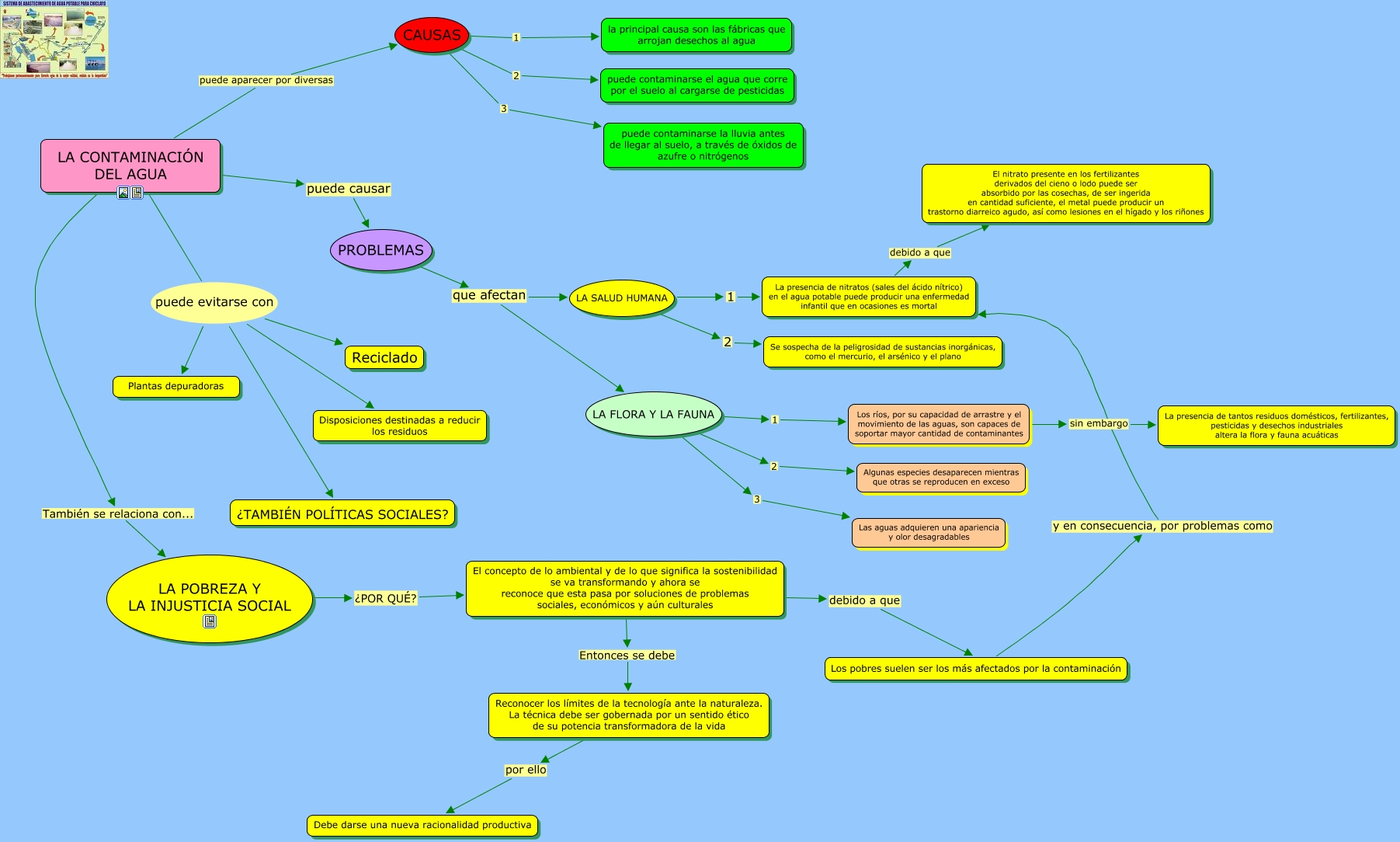Este Cmap, tiene información relacionada con: El agua, PROBLEMAS que afectan LA FLORA Y LA FAUNA, LA SALUD HUMANA 2 Se sospecha de la peligrosidad de sustancias inorgánicas, como el mercurio, el arsénico y el plano, LA CONTAMINACIÓN DEL AGUA puede evitarse con Disposiciones destinadas a reducir los residuos, Los ríos, por su capacidad de arrastre y el movimiento de las aguas, son capaces de soportar mayor cantidad de contaminantes sin embargo La presencia de tantos residuos domésticos, fertilizantes, pesticidas y desechos industriales altera la flora y fauna acuáticas, LA POBREZA Y LA INJUSTICIA SOCIAL ¿POR QUÉ? El concepto de lo ambiental y de lo que significa la sostenibilidad se va transformando y ahora se reconoce que esta pasa por soluciones de problemas sociales, económicos y aún culturales, LA FLORA Y LA FAUNA 3 Las aguas adquieren una apariencia y olor desagradables, LA CONTAMINACIÓN DEL AGUA puede evitarse con Plantas depuradoras, LA CONTAMINACIÓN DEL AGUA puede aparecer por diversas CAUSAS, CAUSAS 2 puede contaminarse el agua que corre por el suelo al cargarse de pesticidas, Reconocer los límites de la tecnología ante la naturaleza. La técnica debe ser gobernada por un sentido ético de su potencia transformadora de la vida por ello Debe darse una nueva racionalidad productiva, CAUSAS 3 puede contaminarse la lluvia antes de llegar al suelo, a través de óxidos de azufre o nitrógenos, LA CONTAMINACIÓN DEL AGUA puede causar PROBLEMAS, Los pobres suelen ser los más afectados por la contaminación y en consecuencia, por problemas como La presencia de nitratos (sales del ácido nítrico) en el agua potable puede producir una enfermedad infantil que en ocasiones es mortal, La presencia de nitratos (sales del ácido nítrico) en el agua potable puede producir una enfermedad infantil que en ocasiones es mortal debido a que El nitrato presente en los fertilizantes derivados del cieno o lodo puede ser absorbido por las cosechas, de ser ingerida en cantidad suficiente, el metal puede producir un trastorno diarreico agudo, así como lesiones en el hígado y los riñones, CAUSAS 1 la principal causa son las fábricas que arrojan desechos al agua, LA FLORA Y LA FAUNA 1 Los ríos, por su capacidad de arrastre y el movimiento de las aguas, son capaces de soportar mayor cantidad de contaminantes, LA CONTAMINACIÓN DEL AGUA puede evitarse con ¿TAMBIÉN POLÍTICAS SOCIALES?, El concepto de lo ambiental y de lo que significa la sostenibilidad se va transformando y ahora se reconoce que esta pasa por soluciones de problemas sociales, económicos y aún culturales Entonces se debe Reconocer los límites de la tecnología ante la naturaleza. La técnica debe ser gobernada por un sentido ético de su potencia transformadora de la vida, LA FLORA Y LA FAUNA 2 Algunas especies desaparecen mientras que otras se reproducen en exceso, LA CONTAMINACIÓN DEL AGUA También se relaciona con... LA POBREZA Y LA INJUSTICIA SOCIAL