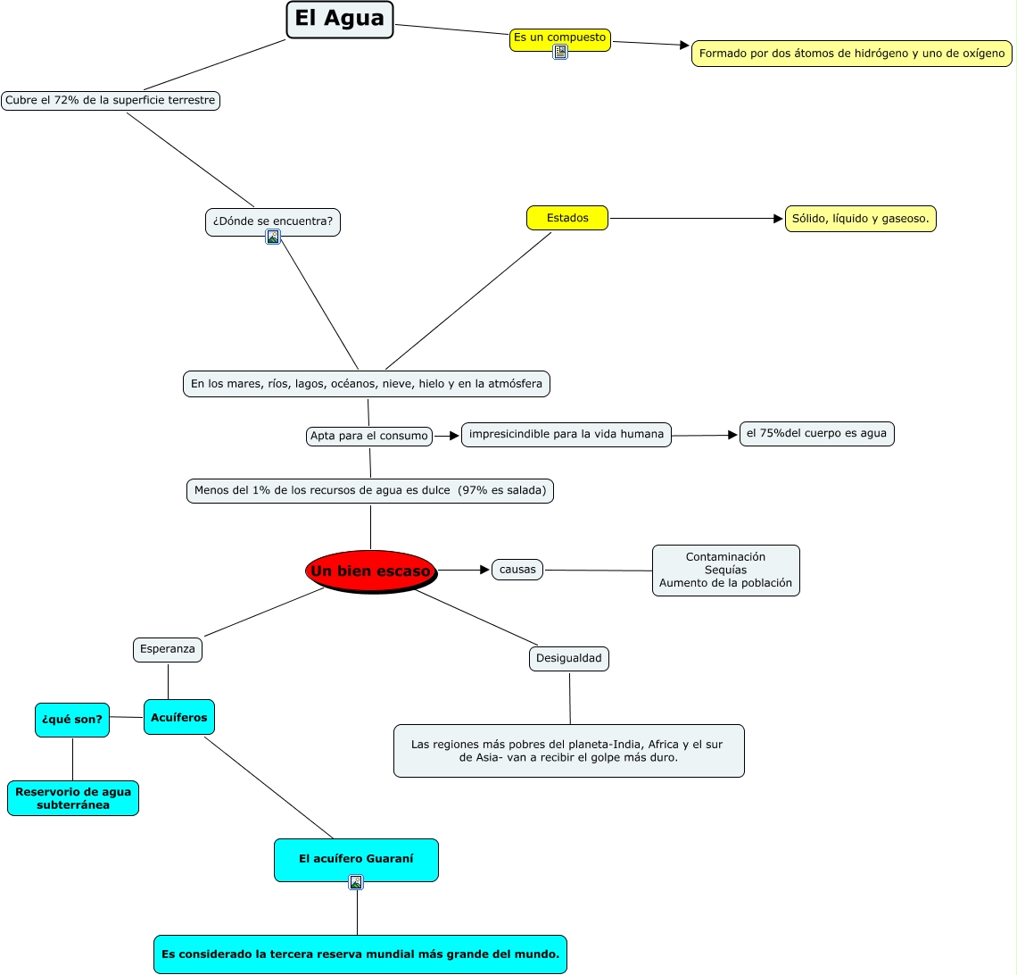 Este Cmap, tiene información relacionada con: agua_mollo, Esperanza ???? Acuíferos, Menos del 1% de los recursos de agua es dulce (97% es salada) Un bien escaso Esperanza, En los mares, ríos, lagos, océanos, nieve, hielo y en la atmósfera Apta para el consumo impresicindible para la vida humana, ¿qué son? ???? Reservorio de agua subterránea, En los mares, ríos, lagos, océanos, nieve, hielo y en la atmósfera Apta para el consumo Menos del 1% de los recursos de agua es dulce (97% es salada), Desigualdad ???? Las regiones más pobres del planeta-India, Africa y el sur de Asia- van a recibir el golpe más duro., Menos del 1% de los recursos de agua es dulce (97% es salada) Un bien escaso Desigualdad, El acuífero Guaraní ???? Es considerado la tercera reserva mundial más grande del mundo., Acuíferos ???? El acuífero Guaraní, El Agua Cubre el 72% de la superficie terrestre ¿Dónde se encuentra?, causas ???? Contaminación Sequías Aumento de la población, El Agua Es un compuesto Formado por dos átomos de hidrógeno y uno de oxígeno, Menos del 1% de los recursos de agua es dulce (97% es salada) Un bien escaso causas, Acuíferos ???? ¿qué son?, impresicindible para la vida humana ???? el 75%del cuerpo es agua, ¿Dónde se encuentra? ???? En los mares, ríos, lagos, océanos, nieve, hielo y en la atmósfera, En los mares, ríos, lagos, océanos, nieve, hielo y en la atmósfera Estados Sólido, líquido y gaseoso.
