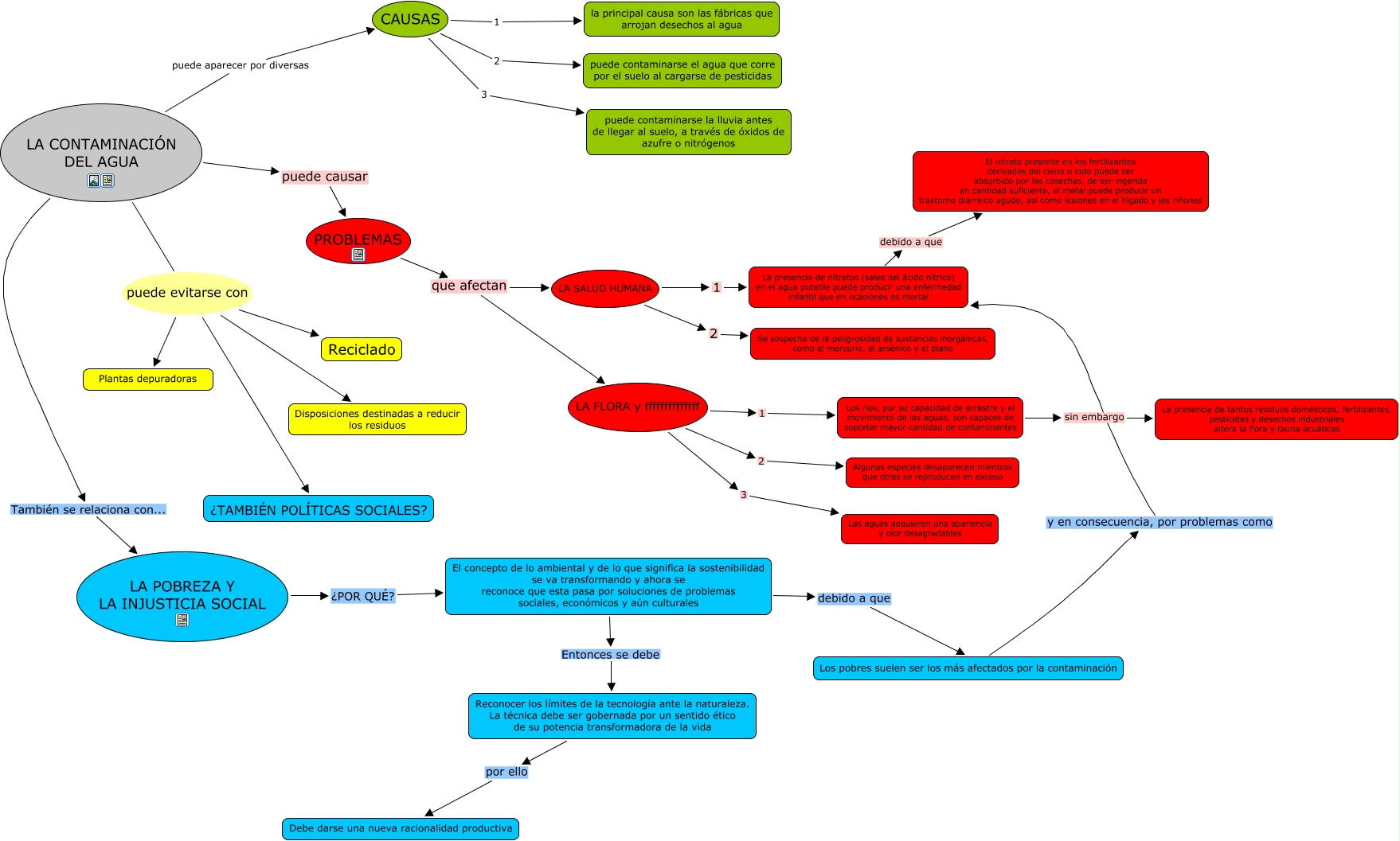 Este Cmap, tiene información relacionada con: El agua, PROBLEMAS que afectan LA FLORA y ffffffffffffff, LA CONTAMINACIÓN DEL AGUA puede evitarse con Disposiciones destinadas a reducir los residuos, LA SALUD HUMANA 2 Se sospecha de la peligrosidad de sustancias inorgánicas, como el mercurio, el arsénico y el plano, Los ríos, por su capacidad de arrastre y el movimiento de las aguas, son capaces de soportar mayor cantidad de contaminantes sin embargo La presencia de tantos residuos domésticos, fertilizantes, pesticidas y desechos industriales altera la flora y fauna acuáticas, LA POBREZA Y LA INJUSTICIA SOCIAL ¿POR QUÉ? El concepto de lo ambiental y de lo que significa la sostenibilidad se va transformando y ahora se reconoce que esta pasa por soluciones de problemas sociales, económicos y aún culturales, CAUSAS 2 puede contaminarse el agua que corre por el suelo al cargarse de pesticidas, LA CONTAMINACIÓN DEL AGUA puede aparecer por diversas CAUSAS, LA CONTAMINACIÓN DEL AGUA puede evitarse con Plantas depuradoras, LA FLORA y ffffffffffffff 3 Las aguas adquieren una apariencia y olor desagradables, Reconocer los límites de la tecnología ante la naturaleza. La técnica debe ser gobernada por un sentido ético de su potencia transformadora de la vida por ello Debe darse una nueva racionalidad productiva, Los pobres suelen ser los más afectados por la contaminación y en consecuencia, por problemas como La presencia de nitratos (sales del ácido nítrico) en el agua potable puede producir una enfermedad infantil que en ocasiones es mortal, LA CONTAMINACIÓN DEL AGUA puede causar PROBLEMAS, CAUSAS 3 puede contaminarse la lluvia antes de llegar al suelo, a través de óxidos de azufre o nitrógenos, CAUSAS 1 la principal causa son las fábricas que arrojan desechos al agua, La presencia de nitratos (sales del ácido nítrico) en el agua potable puede producir una enfermedad infantil que en ocasiones es mortal debido a que El nitrato presente en los fertilizantes derivados del cieno o lodo puede ser absorbido por las cosechas, de ser ingerida en cantidad suficiente, el metal puede producir un trastorno diarreico agudo, así como lesiones en el hígado y los riñones, LA FLORA y ffffffffffffff 1 Los ríos, por su capacidad de arrastre y el movimiento de las aguas, son capaces de soportar mayor cantidad de contaminantes, LA CONTAMINACIÓN DEL AGUA puede evitarse con ¿TAMBIÉN POLÍTICAS SOCIALES?, LA SALUD HUMANA 1 La presencia de nitratos (sales del ácido nítrico) en el agua potable puede producir una enfermedad infantil que en ocasiones es mortal, LA CONTAMINACIÓN DEL AGUA También se relaciona con... LA POBREZA Y LA INJUSTICIA SOCIAL, LA FLORA y ffffffffffffff 2 Algunas especies desaparecen mientras que otras se reproducen en exceso
